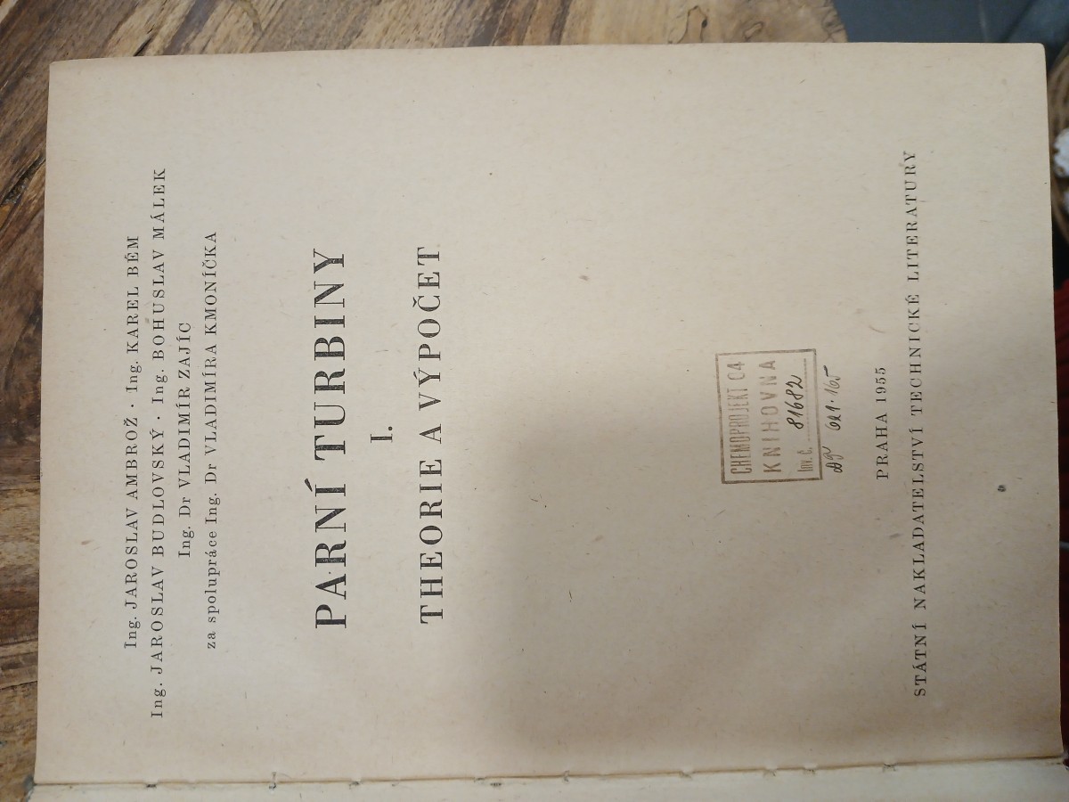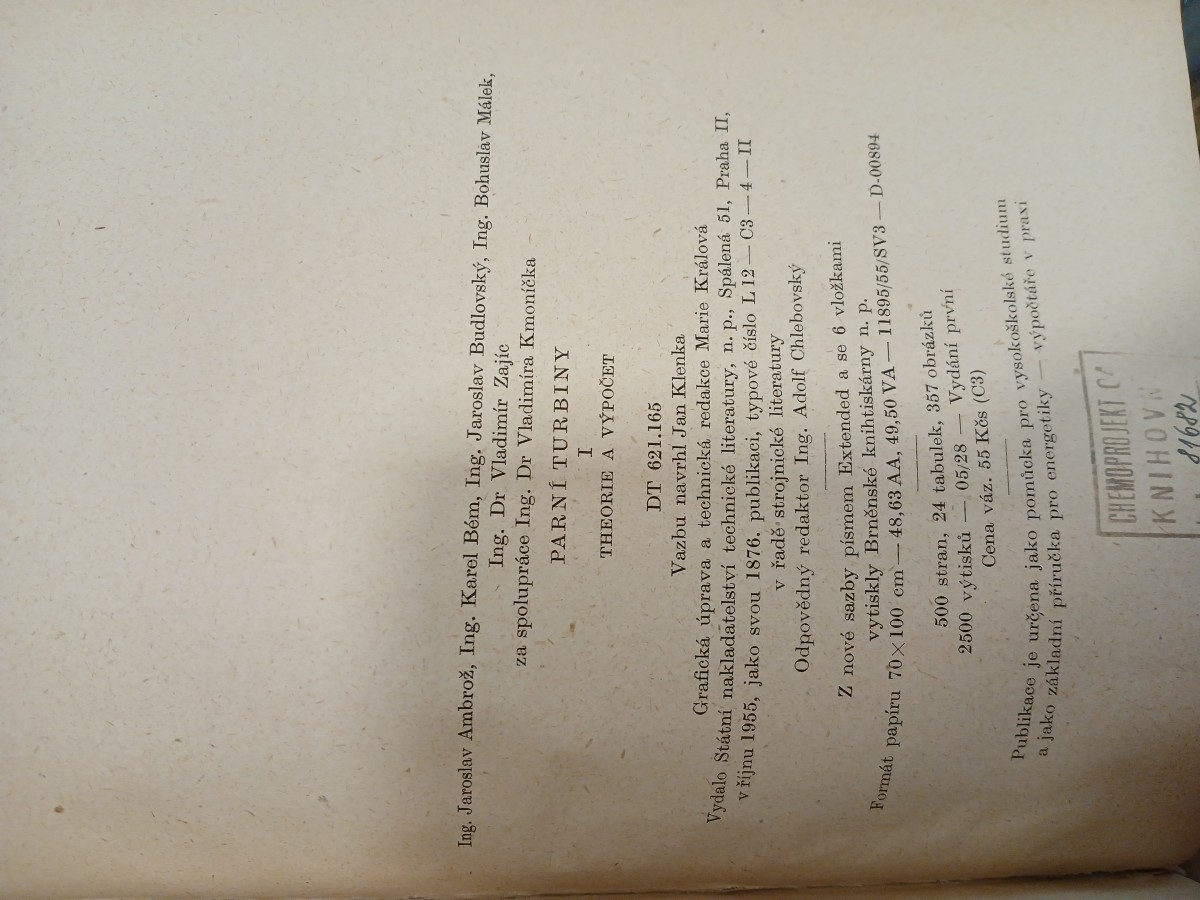 | Digitalizovaná tiráž: | Ing. Jaroslav Ambrož, Ing. Karel Bém, Ing. Jaroslav Budlovský, Ing. Bohuslav Málek, Ing. Dr Vladimír Zajíc za spolupráce Ing. Dr Vladimíra Kmoníčka PARNÍ TURBINY I THEORIE A VÝPOČET DT 621.165 Vazbu navrhl Jan Klenka Grafická úprava a technická redakce Marie Králová Vydalo Státní nakladatelství technické literatury, n. p., Spálená 51, Praha II, v říjnu 1955, jako svou 1876. publikaci, typové číslo L 12-C3-4-II v řadě strojnické literatury Odpovědný redaktor Ing. Adolf Chlebovský Z nové sazby písmem Extended a se 6 vložkami vytiskly Brněnské knihtiskárny n. p. Formát papíru 70x100 cm 48,63 AA, 49,50 VA-11895/55/SV3-D-00894 500 stran, 24 tabulek, 357 obrázků 2500 výtisků - 05/28 Vydání první Cena váz. 55 Kčs (C3) Publikace je určena jako pomůcka pro vysokoškolské studium a jako základní příručka pro energetiky výpočtáře v praxi CHEMOPROJEKT CA KNIHOVN 81682 |