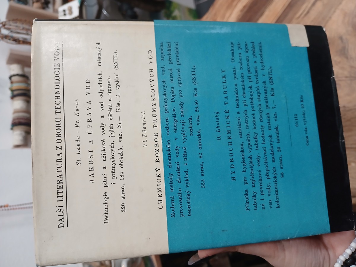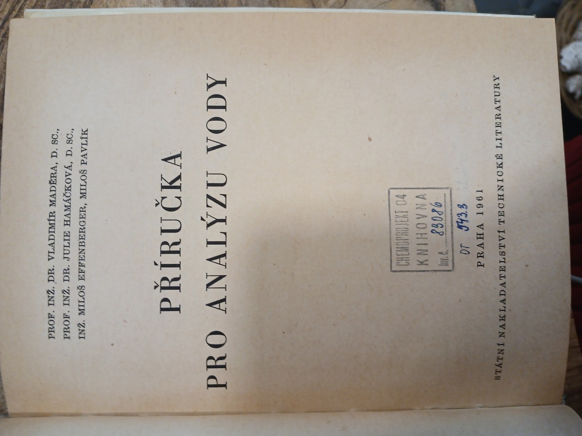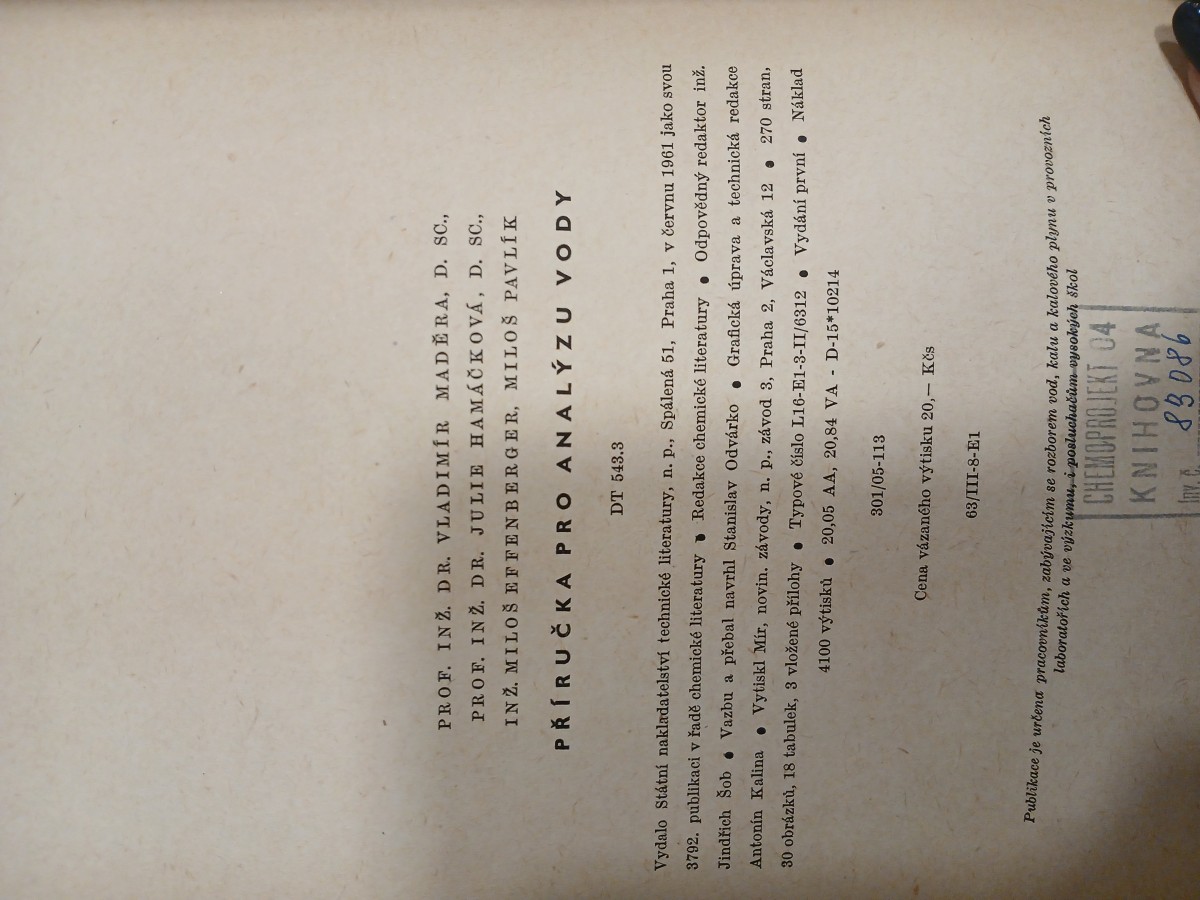 | Digitalizovaná tiráž: | PROF. INŽ. DR. VLADIMÍR MADERA, D. SC., PROF. IN 2. DR. JULIE HAMAČKOVÁ, D. SC., INŽ. MILOŠ EFFENBERGER, MILOŠ PAVLÍK PŘÍRUČKA PRO ANALÝZU VODY DT 543.3 Vydalo Státní nakladatelství technické literatury, n. p., Spálená 51, Praha 1, v červnu 1961 jako svou 3792. publikaci v řadě chemické literatury Redakce chemické literatury Odpovědný redaktor inž. Jindřich Šob Vazbu a přebal navrhl Stanislav Odvárko Grafická úprava a technická redakce Antonín Kalina Vytiskl Mír, novin. závody, n. p., závod 3, Praha 2, Václavská 12 270 stran, 30 obrázků, 18 tabulek, 3 vložené přílohy Typové číslo L16-E1-3-II/6312 Vydání první 4100 výtisků ⚫ 20,05 AA, 20,84 VA - D-15*10214 301/05-113 Cena vázaného výtisku 20,- Kčs 63/III-8-E1 Náklad Publikace je určena pracovníkům, zabývajícím se rozborem vod, kalu a kalového plynu v provozních laboratořích a ve výzkumu, i posluchačům vysokých škol CHEMOPROJEKT 04 KNIHOVNA 83086 |