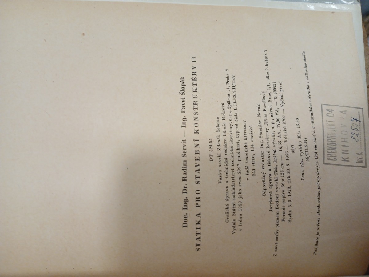 | Digitalizovaná tiráž: | Doc. Ing. Dr. Radim Servit - Ing. Pavel Šlapák STATIKA PRO STAVEBNÍ KONSTRUKTÉRY II DT 624.04 Vazbu navrhl Zdeněk Šebesta Grafická úprava a technická redakce Libuše Hokrová Vydalo Státní nakladatelství technické literatury, n. p., Spálená 51, Praha 2 v lednu 1959 jako svou 2897. publikaci, typové číslo L 11-B2-4-11/1169 v řadě teoretické literatury 240 stran, 114 obrázků Odpovědný redaktor Ing. Stanislav Novák Jazyková úprava a tiskové korektury Jiřina Pavelková Z nové sazby písmem Bodoni vytiskl Tisk, knižní výroba, n. p., závod Brno, 1/1, ulice 9. května 7 Formát papíru 86 x 122 cm- Sazba 5. 3. 1958, tisk 23. 9. 1958- 16,55 AA, 17,00 VA, D 580931 05/7 Výtisků 2700- Vydání první Cena váz. výtisku Kés 15,80 56/IIL-5-B2 Publikace je určena absolventům průmyslových škol stavebních a účastníkům večerního a dálkového studia CHEMOPROJEKT 04 KNIHOV A lav. C. 82507 |