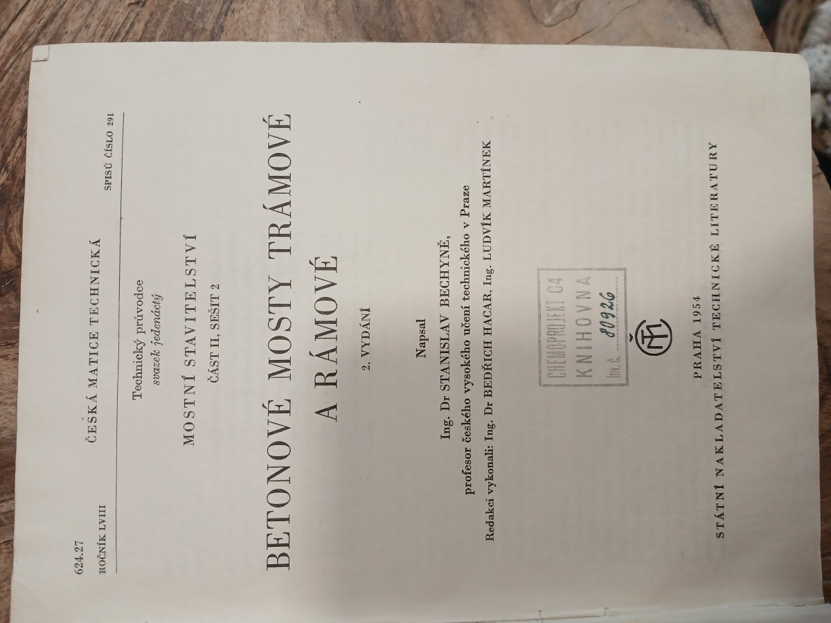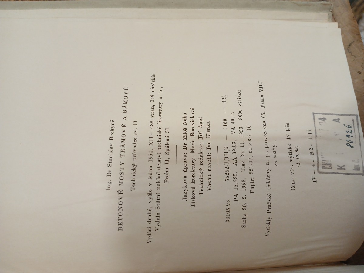 | Digitalizovaná tiráž: | Ing. Dr Stanislav Bechyně BETONOVÉ MOSTY TRÁMOVÉ A RÁMOVÉ Technický průvodce sv. 11 Vydání druhé, vyšlo v lednu 1954, XII+ 488 stran, 349 obrázků Vydalo Státní nakladatelství technické literatury n. p., Praha II, Spálená 51 Jazyková úprava: Dr Miloš Noha Tiskové korektury: Marie Borovičková Technický redaktor: Jiří Appl Vazbu navrhl: Jan Klenka 30105 93 56252/1/III/2 - 1160 4% PA 15,625, AA 39,03, VA 40,14 Sazba 20. 2. 1953. Tisk 24. 11. 1953. 5000 výtisků Papír: 221-07, 61 × 86, 70 Vytiskly Pražské tiskárny n. p., provozovna 05, Praha VIII ze sazby Cena váz. výtisku 47 Kčs (1. 10.53) IV-4 B2-L17 CHEM 704 K A 80926 Lov. C. |