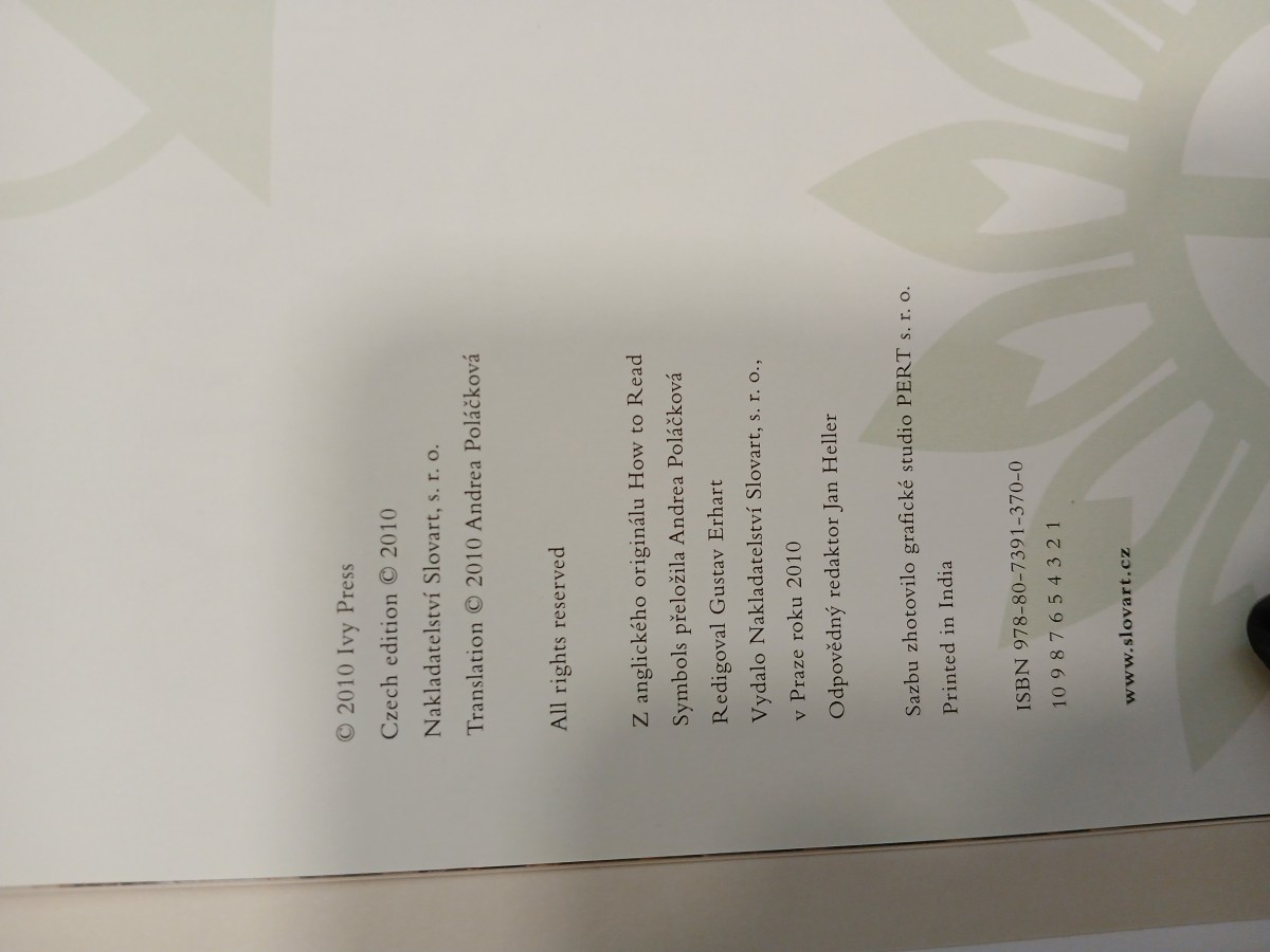 | Digitalizovaná tiráž: | © 2010 Ivy Press Czech edition © 2010 Nakladatelství Slovart, s. r. o. Translation © 2010 Andrea Poláčková All rights reserved Z anglického originálu How to Read Symbols přeložila Andrea Poláčková Redigoval Gustav Erhart Vydalo Nakladatelství Slovart, s. r. o., v Praze roku 2010 Odpovědný redaktor Jan Heller Sazbu zhotovilo grafické studio PERT s. r. o. Printed in India ISBN 978-80-7391-370-0 10 9 8 7 6 5 4 3 2 1 www.slovart.cz |