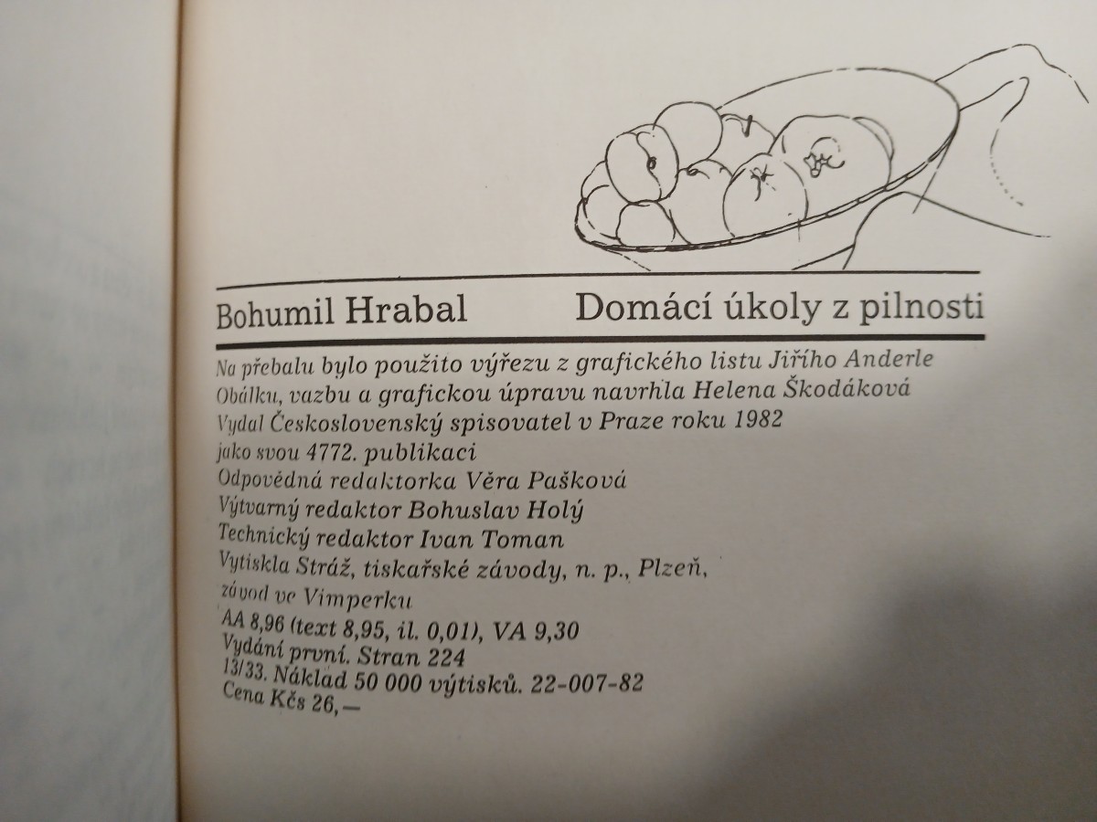 | Digitalizovaná tiráž: | Bohumil Hrabal Domácí úkoly z pilnosti Na přebalu bylo použito výřezu z grafického listu Jiřího Anderle Obálku, vazbu a grafickou úpravu navrhla Helena Škodáková Vydal Československý spisovatel v Praze roku 1982 jako svou 4772. publikaci Odpovědná redaktorka Věra Pašková Výtvarný redaktor Bohuslav Holý Technický redaktor Ivan Toman Vytiskla Stráž, tiskařské závody, n. p., Plzeň, zúvod ve Vimperku AA 8,96 (text 8,95, il. 0,01), VA 9,30 Vydání první. Stran 224 13/33. Náklad 50 000 výtisků. 22-007-82 Cena Kčs 26,- |