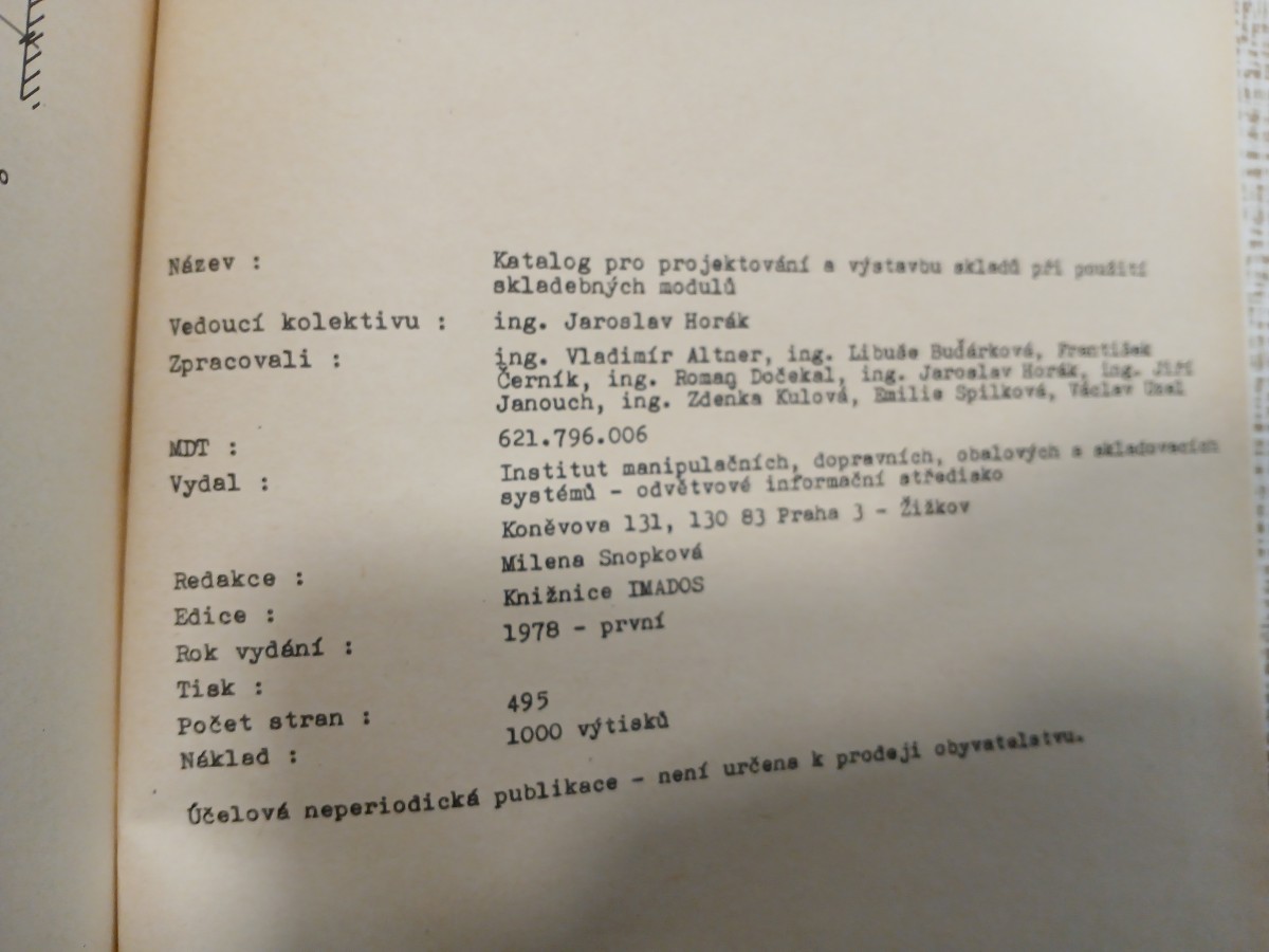 | Digitalizovaná tiráž: | O Název: Vedoucí kolektivu : Zpracovali : MDT: Vydal: Redakce: Katalog pro projektování a výstavbu skladd při poudit skladebných moduld ing. Jaroslav Horák ing. Vladimír Altner, ing. Libuše Budárková, Frantiik Černík, ing. Roman Dočekal, ing. Jaroslav Horák, ing. AM Janouch, ing. Zdenka Kulová, Emilie Spilková, Václav al 621.796.006 Institut manipulačních, dopravních, obalových a skladovaci systémů odvětvové informační středisko Koněvova 131, 130 83 Praha 3 - Žižkov Milena Snopková Knižnice IMADOS Edice: Rok vydání: 1978 Tisk : Počet stran: 495 Náklad: první 1000 výtisků - není určena k prodeji obyvatelstvu. Účelová neperiodická publikace |