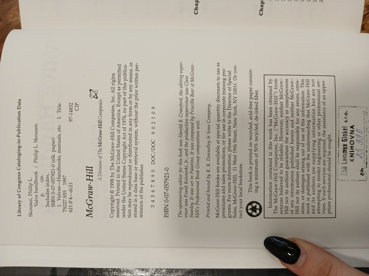 | Digitalizovaná tiráž: | Library of Congress Cataloging-in-Publication Data Skousen, Philip L. Valve handbook Philip L. Skousen. P. cm. Includes index. ISBN 0-07-057921-0 (alk. paper) 1. Valves-Handbooks, manuals, etc. I. Title. TS227.S55 1997 621.8'4-dc21 97-14832 CIP McGraw-Hill A Division of The McGraw-Hill Companies Copyright © 1998 by The McGraw-Hill Companies, Inc. All rights reserved. Printed in the United States of America. Except as permitted under the United States Copyright Act of 1976, no part of this publica- tion may be reproduced or distributed in any form or by any means, or stored in a data base or retrieval system, without the prior written per- mission of the publisher. 3 4 5 6 7 8 9 0 DOC/DOC 90 21 09 ISBN 0-07-057921-0 The sponsoring editor for this book was Harold B. Crawford, the editing super- visor was Frank Kotowski, Jr., and the production supervisor was Clare Stanley. It was set in Palatino. It was composed by Priscilla Beer of McGraw- Hill's Professional Book Group composition unit. Printed and bound by R. R. Donnelley & Sons Company. McGraw-Hill books are available at special quantity discounts to use as premiums and sales promotions, or for use in corporate training pro- grams. For more information, please write to the Director of Special Sales, McGraw-Hill, 11 West 19th Street, New York, NY 10011. Or con- tact your local bookstore. This book is printed on recycled, acid-free paper contain- ing a minimum of 50% recycled, de-inked fiber. Information contained in this work has been obtained by The McGraw-Hill Companies, Inc. ("McGraw-Hill") from sources believed to be reliable. However, neither McGraw- Hill nor its authors guarantees the accuracy or completeness of any information published herein and neither McGraw- Hill nor its authors shall be responsible for any errors, omis- sions, or damages arising out of use of this information. This work is published with the understanding that McGraw-Hill and its authors are supplying information but are not attempting to render engineering or other professional ser- vices. If such services are required, the assistance of an appro- priate professional should be sought. A98 Lommps Global ... KNIHOVNA 25.990 Chap Chap 2 2 |
