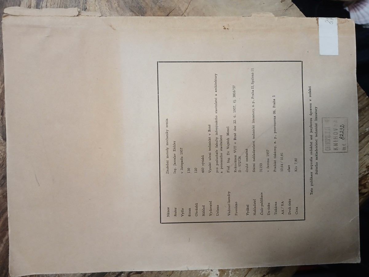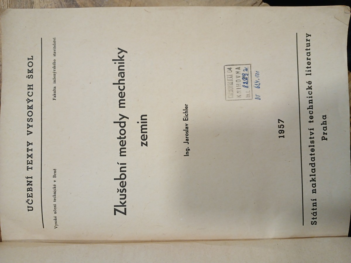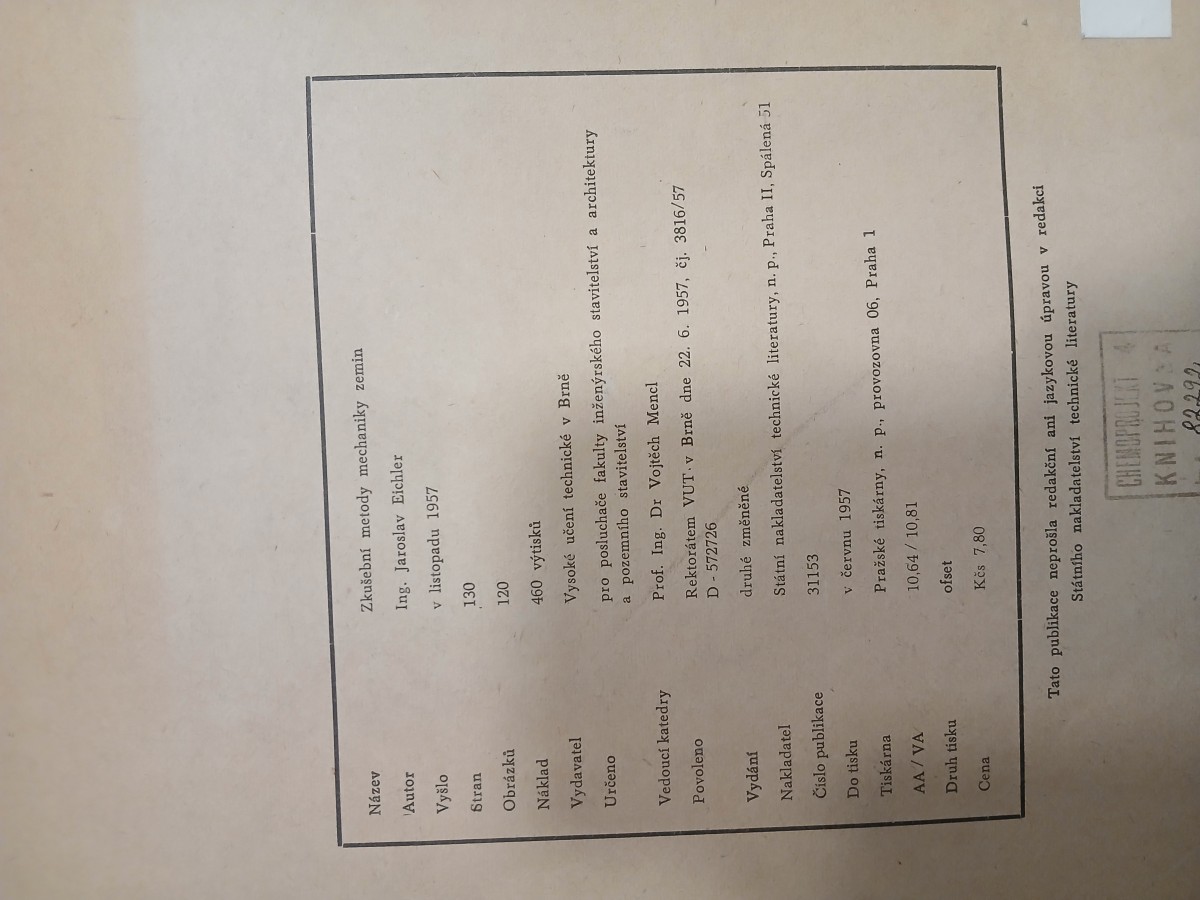 | Digitalizovaná tiráž: | Název Autor Vyšlo Stran Obrázků Náklad Vydavatel Určeno Vedoucí katedry Povoleno Vydání Nakladatel Cislo publikace Do tisku Tiskárna AA/VA Druh tisku Cena Zkušební metody mechaniky zemin Ing. Jaroslav Eichler v listopadu 1957 130 120 460 výtisků Vysoké učení technické v Brně pro posluchače fakulty inženýrského stavitelství a architektury a pozemního stavitelství Prof. Ing. Dr Vojtěch Mencl Rektorátem VUT v Brně dne 22. 6. 1957, čj. 3816/57 D - 572726 druhé změněné Státní nakladatelství technické literatury, n. p., Praha II, Spálená 51 31153 v červnu 1957 Pražské tiskárny, n. p., provozovna 06, Praha 1 10,64/10,81 ofset Kčs 7,80 Tato publikace neprošla redakční ani jazykovou úpravou v redakci Státního nakladatelství technické literatury CHEMOPROJEKT 4 KNIHOVNA 82292 |