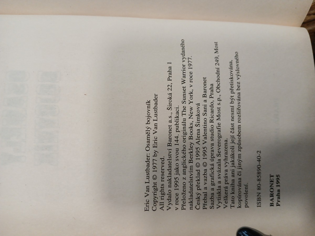 | Digitalizovaná tiráž: | Eric Van Lustbader: Osamělý bojovník Copyright © 1977 by Eric Van Lustbader All rights reserved. Vydalo nakladatelství Baronet a.s., Široká 22, Praha 1 v roce 1995 jako svou 144. publikaci. Přeloženo z anglického originálu The Sunset Warrior vydaného nakladatelstvím Berkley Books, New York, v roce 1977. Český překlad © 1995 Alena Šimková Přebal a vazba © 1995 Valentino Sani a Baronet Sazba a grafická úprava studio Ricardo, Praha Vytiskla a svázala Severografie Most s.p., Obchodní 249, Most Veškerá práva vyhrazena. Tato kniha ani jakákoli její část nesmí být přetiskována, kopírována či jiným způsobem rozšiřována bez výslovného povolení. ISBN 80-85890-40-2 BARONET Praha 1995 |
