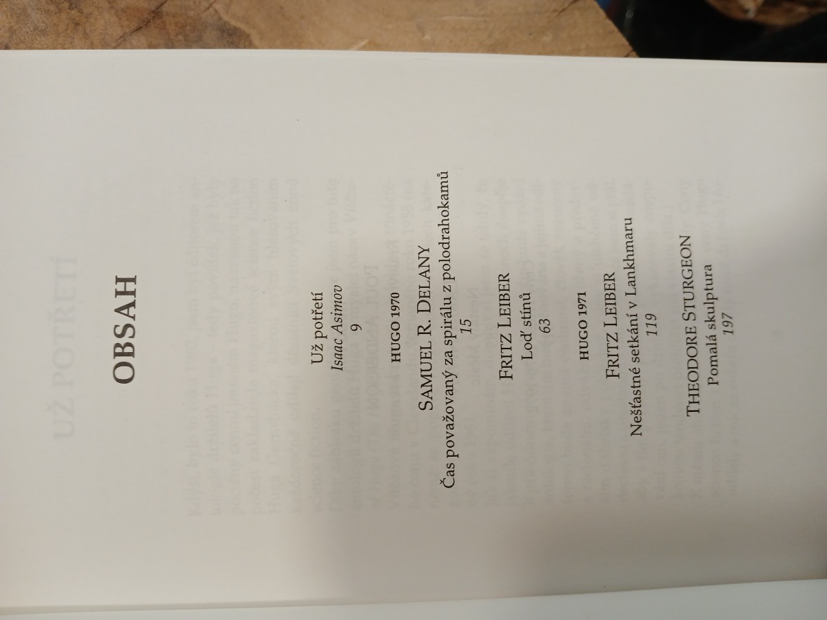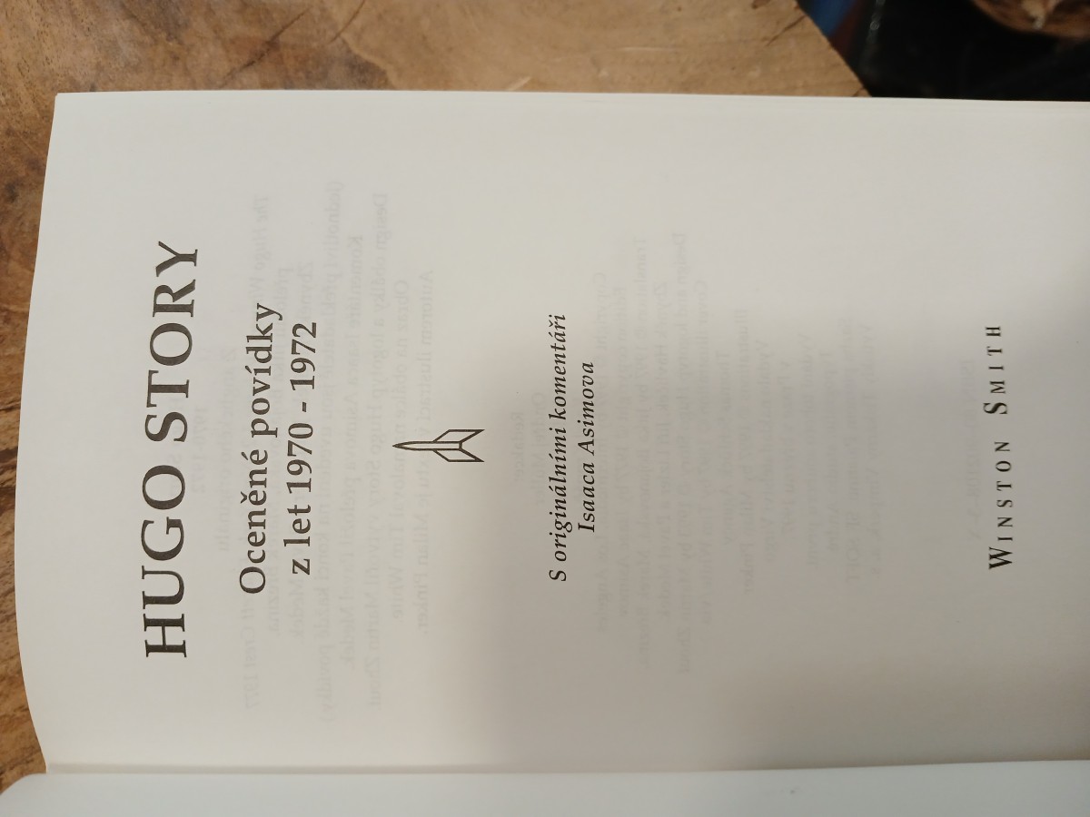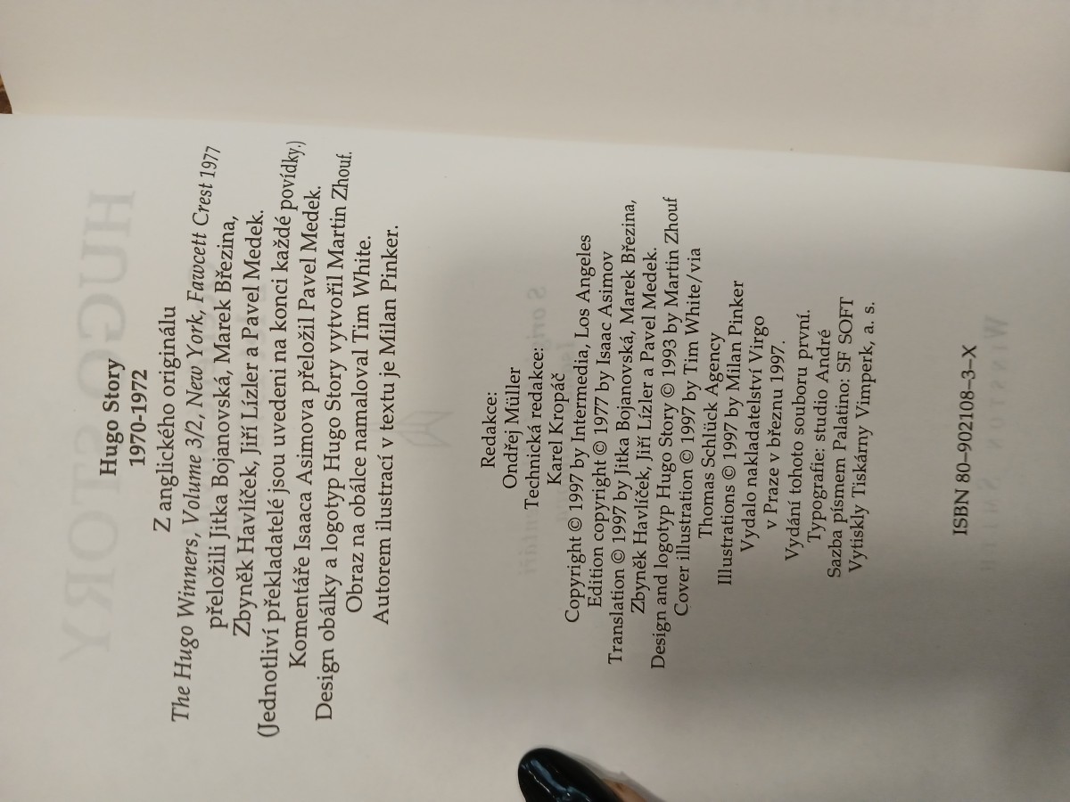 | Digitalizovaná tiráž: | Y H Hugo Story 1970-1972 Z anglického originálu The Hugo Winners, Volume 3/2, New York, Fawcett Crest 1977 přeložili Jitka Bojanovská, Marek Březina, Zbyněk Havlíček, Jiří Lízler a Pavel Medek. (Jednotliví překladatelé jsou uvedeni na konci každé povídky.) Komentáře Isaaca Asimova přeložil Pavel Medek. Design obálky a logotyp Hugo Story vytvořil Martin Zhouf. Obraz na obálce namaloval Tim White. Autorem ilustrací v textu je Milan Pinker. Redakce: Ondřej Müller Technická redakce: 02 Karel Kropáč Copyright © 1997 by Intermedia, Los Angeles Edition copyright © 1977 by Isaac Asimov Translation © 1997 by Jitka Bojanovská, Marek Březina, Zbyněk Havlíček, Jiří Lízler a Pavel Medek. Design and logotyp Hugo Story 1993 by Martin Zhouf Cover illustration © 1997 by Tim White/via Thomas Schlück Agency Illustrations 1997 by Milan Pinker Vydalo nakladatelství Virgo v Praze v březnu 1997. Vydání tohoto souboru první. Typografie: studio André Sazba písmem Palatino: SF SOFT Vytiskly Tiskárny Vimperk, a. s. ISBN 80-902108-3-X |