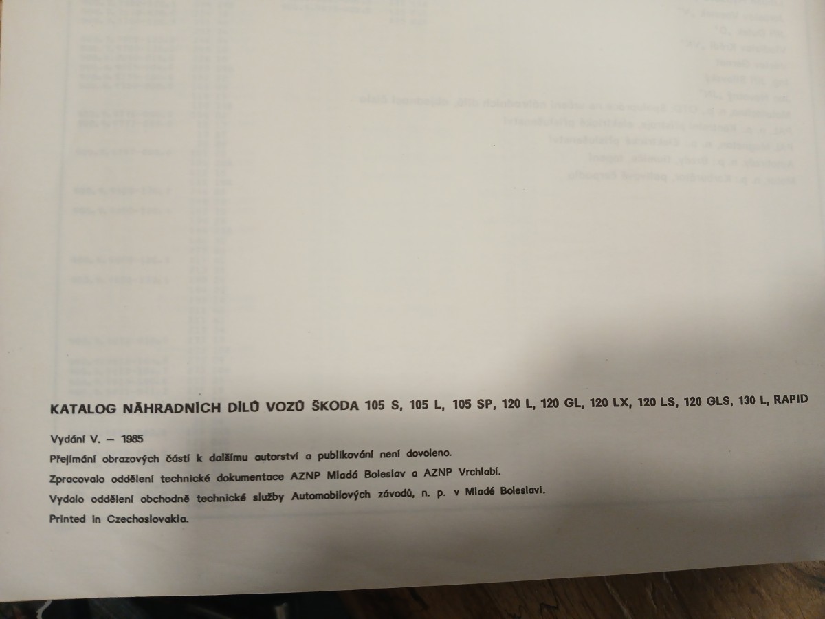 | Digitalizovaná tiráž: | KATALOG NÁHRADNÍCH DILO VOZO SKODA 105 S, 105 L, 105 SP, 120 L, 120 GL, 120 LX, 120 LS, 120 GLS, 130 L, RAPID Vydání V. - 1985 Přejímání obrazových částí k dalšímu autorství a publikování není dovoleno. Zpracovalo oddělení technické dokumentace AZNP Mladá Boleslav a AZNP Vrchlabí. Vydalo oddělení obchodně technické služby Automobilových závodů, n. p. v Mladé Boleslavi. Printed in Czechoslovakia. |