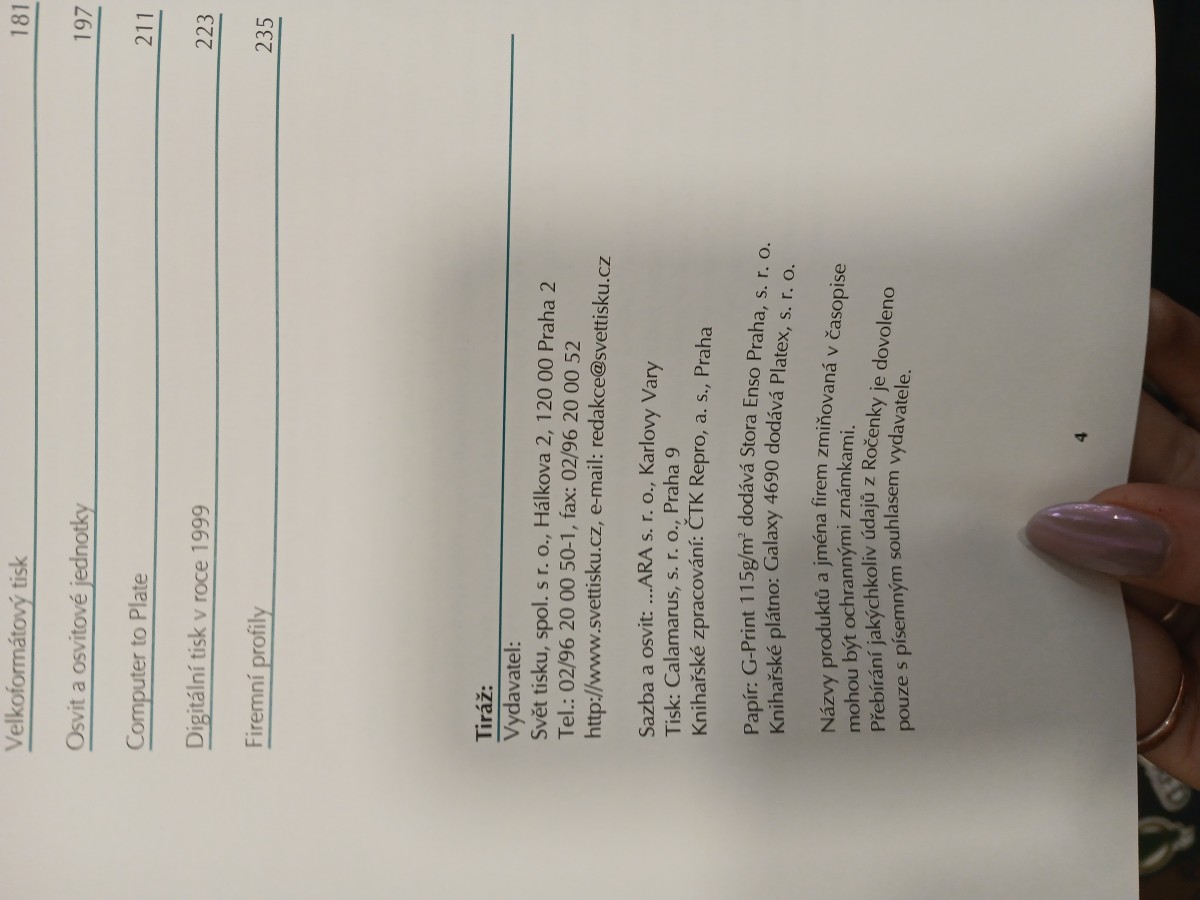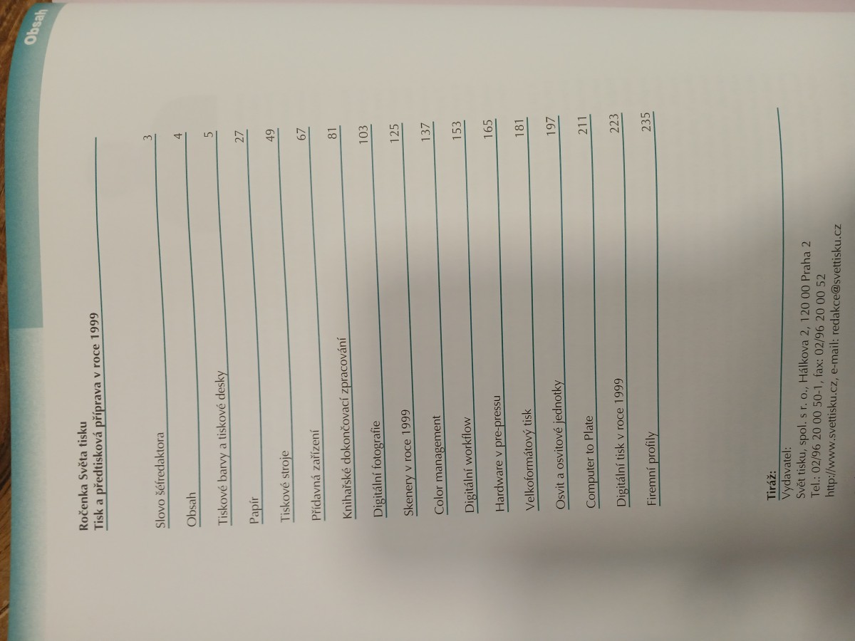 Digitalizovaná tiráž: 181 Velkoformátový tisk 197 Osvit a osvitové jednotky 211 Computer to Plate 223 Digitální tisk v roce 1999 235 Firemní profily Tiráž: Vydavatel: Svět tisku, spol. s r. o., Hálkova 2, 120 00 Praha 2 Tel.: 02/96 20 00 50-1, fax: 02/96 20 00 52 http://www.svettisku.cz, e-mail: redakce@svettisku.cz Sazba a osvit: ...ARA s. r. o., Karlovy Vary Tisk: Calamarus, s. r. o., Praha 9 Knihařské zpracování: ČTK Repro, a. s., Praha Papír: G-Print 115g/m² dodává Stora Enso Praha, s. r. O. Knihařské plátno: Galaxy 4690 dodává Platex, s. r. o. Názvy produktů a jména firem zmiňovaná v časopise mohou být ochrannými známkami. pouze s písemným souhlasem vydavatele. Přebírání jakýchkoliv údajů z Ročenky je dovoleno