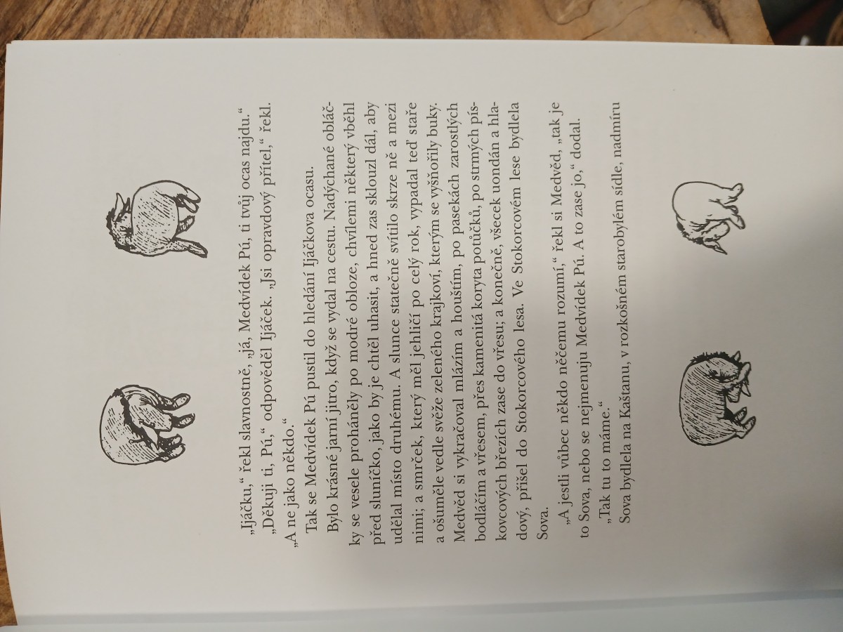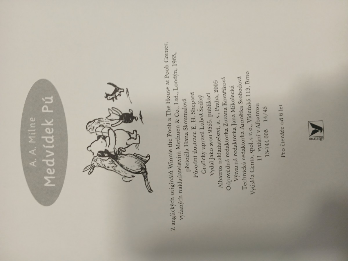 | Digitalizovaná tiráž: | A. A. Milne Medvídek Pú Z anglických originálů Winnie the Pooh a The House at Pooh Corner, vydaných nakladatelstvím Methuen & Co., Ltd., Londýn, 1965, přeložila Hana Skoumalová Původní ilustrace E. H. Shepard Graficky upravil Luboš Šedivý Vydal jako svou 9555. publikaci Albatros nakladatelství, a. s., Praha, 2005 Odpovědná redaktorka Zuzana Kovaříková Výtvarná redaktorka Jana Mikulecká Technická redaktorka Arnoštka Svobodová Vytiskla Centa, spol. s r. o., Vídeňská 113, Brno 11. vydání v Albatrosu 13-744-005 14/45 Pro čtenáře od 6 let |