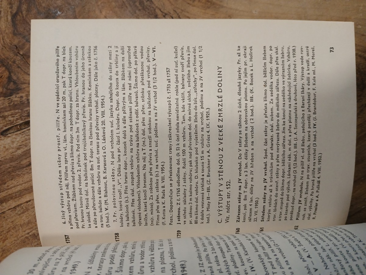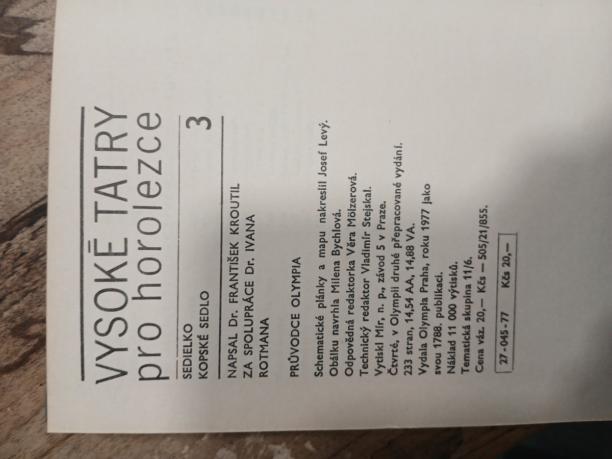 | Digitalizovaná tiráž: | VYSOKE TATRY pro horolezce SEDIELKO KOPSKÉ SEDLO NAPSAL Dr. FRANTIŠEK KROUTIL ZA SPOLUPRÁCE Dr. IVANA ROTMANA PRŮVODCE OLYMPIA 3 Schematické plánky a mapu nakreslil Josef Levý. Obálku navrhla Milena Bychlová. Odpovědná redaktorka Věra Mölzerová. Technický redaktor Vladimír Stejskal. Vytiskl Mír, n. p., závod 5 v Praze. Čtvrté, v Olympii druhé přepracované vydání. 233 stran, 14,54 AA, 14,88 VA. Vydala Olympia Praha, roku 1977 jako svou 1788. publikaci. Náklad 11 000 výtisků. Tematická skupina 11/6. Cena váz. 20,- Kčs - 505/21/855. 27-045-77 Kčs 20,- |