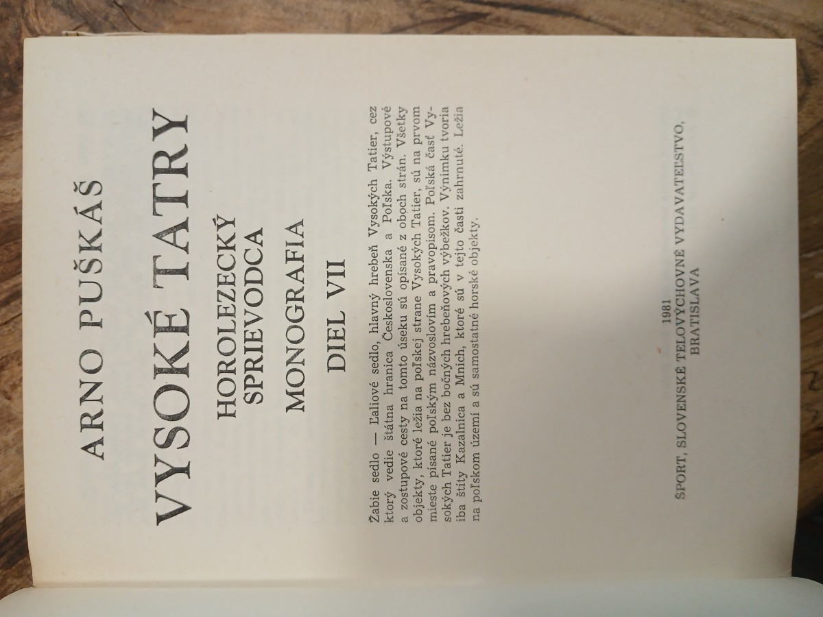| Digitalizovaná tiráž: | ARNO PUŠKÁŠ VYSOKÉ TATRY HOROLEZECKÝ SPRIEVODCA MONOGRAFIA DIEL VII Žabie sedlo - Ľaliové sedlo, hlavný hrebeň Vysokých Tatier, cez ktorý vedie štátna hranica Československa a Poľska. Výstupové a zostupové cesty na tomto úseku sú opísané z oboch strán. Všetky objekty, ktoré ležia na poľskej strane Vysokých Tatier, sú na prvom mieste písané poľským názvoslovím a pravopisom. Poľská časť Vy- sokých Tatier je bez bočných hrebeňových výbežkov. Výnimku tvoria iba štíty Kazalnica a Mnich, ktoré sú v tejto časti zahrnuté. Ležia na poľskom území a sú samostatné horské objekty. 1981 SPORT, SLOVENSKÉ TELOVÝCHOVNÉ VYDAVATEĽSTVO, BRATISLAVA |