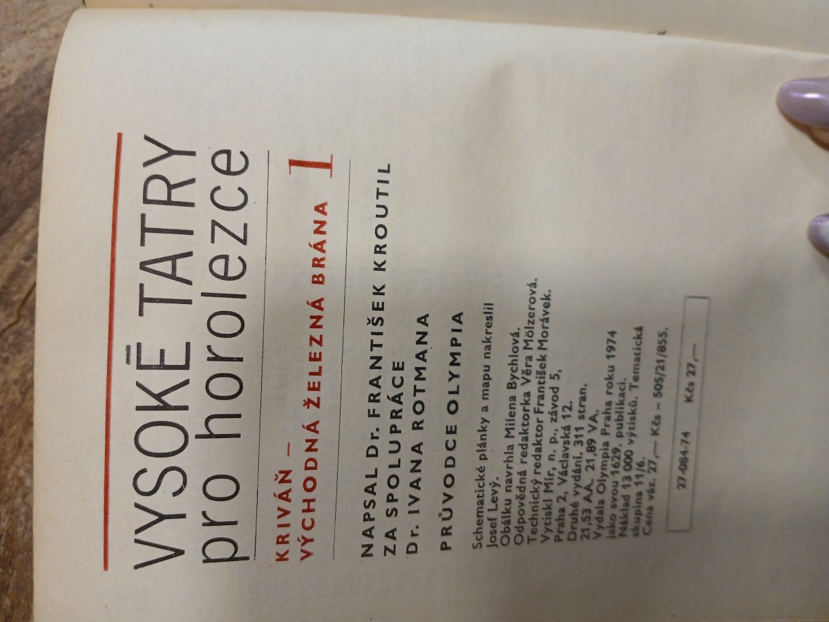 | Digitalizovaná tiráž: | VYSOKÉ TATRY pro horolezce KRIVÁŇ VÝCHODNÁ ŽELEZNÁ BRÁNA 1 NAPSAL Dr. FRANTIŠEK KROUTIL ZA SPOLUPRÁCE Dr. IVANA ROTMANA PRŮVODCE OLYMPIA Schematické plánky a mapu nakreslil Josef Levý. Obálku navrhla Milena Bychlová. Odpovědná redaktorka Věra Mölzerová. Technický redaktor František Morávek. Vytiskl Mir, n. p., závod 5, Praha 2, Václavská 12. Druhé vydání. 311 stran. 21,53 AA. 21,89 VA. Vydala Olympia Praha roku 1974 jako svou 1629. publikaci. Náklad 13 000 výtisků. Tematická skupina 11/6. Cena váz. 27,- Kčs - 505/21/855. 27-084-74 Kts 27,- |
