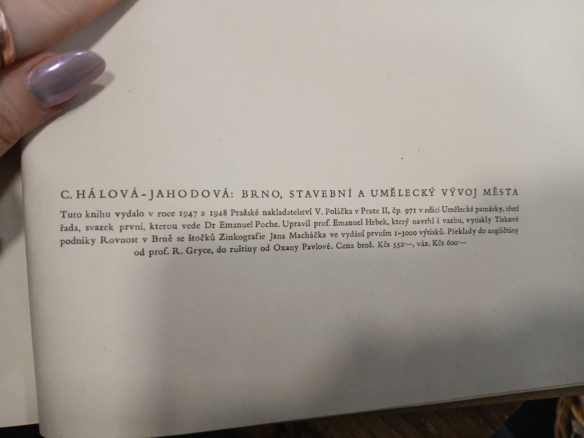 | Digitalizovaná tiráž: | C. HÁLOVÁ-JAHODOVÁ: BRNO, STAVEBNÍ A UMĚLECKÝ VÝVOJ MĚSTA Tuto knihu vydalo v roce 1947 a 1948 Pražské nakladatelství V. Poláčka v Praze II, čp. 971 v edici Umělecké památky, třetí řada, svazek první, kterou vede Dr Emanuel Poche. Upravil prof. Emanuel Hrbek, který navrhli vazbu, vytiskly Tiskové podniky Rovnost v Brně se štočků Zinkografie Jana Macháčka ve vydání prvním 1-3000 výtisků. Překlady do angličtiny od prof. R. Gryce, do ruštiny od Oxany Pavlové. Cena brož. Kčs 552-, váz. Kčs 600°- |