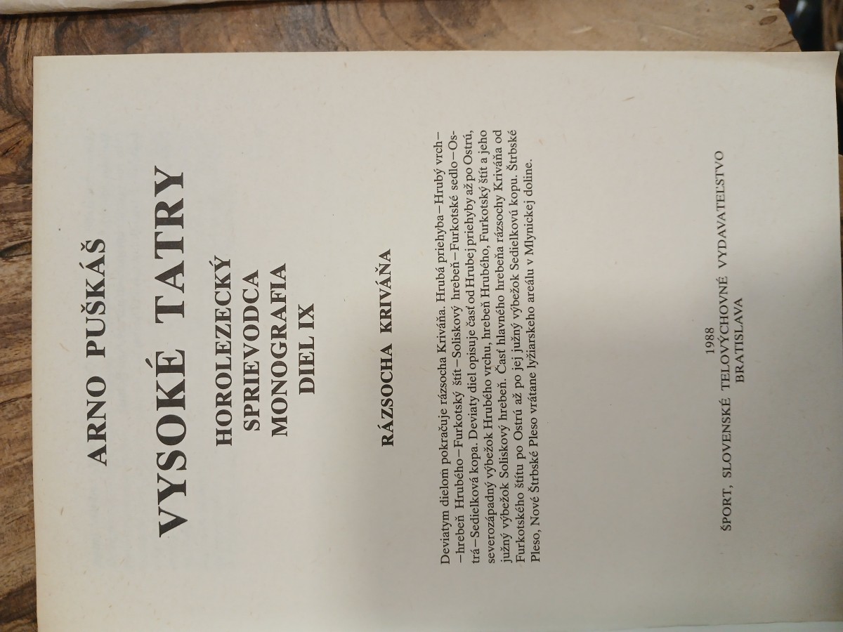 | Digitalizovaná tiráž: | Arno Puškáš VYSOKÉ TATRY HOROLEZECKÝ SPRIEVODCA MONOGRAFIA DIEL IX Lektorovali Ivan Bohuš a Ivan Dieška Vydal Šport, slovenské telovýchovné vydavateľstvo, Bratislava ako svoju 1 162. publikáciu. Obálku s použitím fotografií Stanislava Matveja navrhol Arno Puškáš. Prvé vydanie. Počet strán 192 + 80. Počet príloh 5. Šéfredaktor Anton Richter. Zodpovedná redaktorka Oľga Rázgová. Technická redaktorka Kristína Vozáková. SÚKK 121/1-88. Náklad 12 000. AH 25,97 (11,23 + 14,60 + 0,14). VH 26,18. Vytlačili Tlačiarne SNP, štátny podnik, Martin. 077-031-88 VTH 11-6 Kčs 38,- |