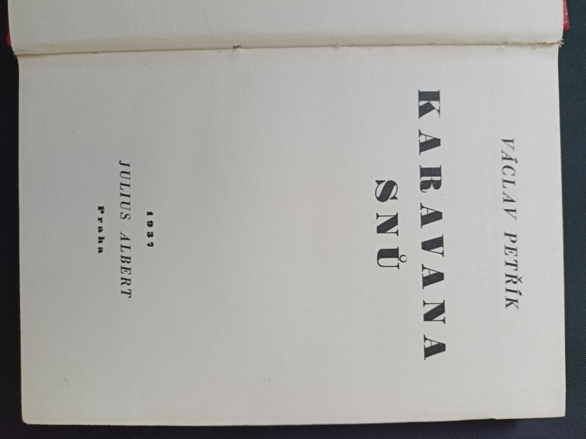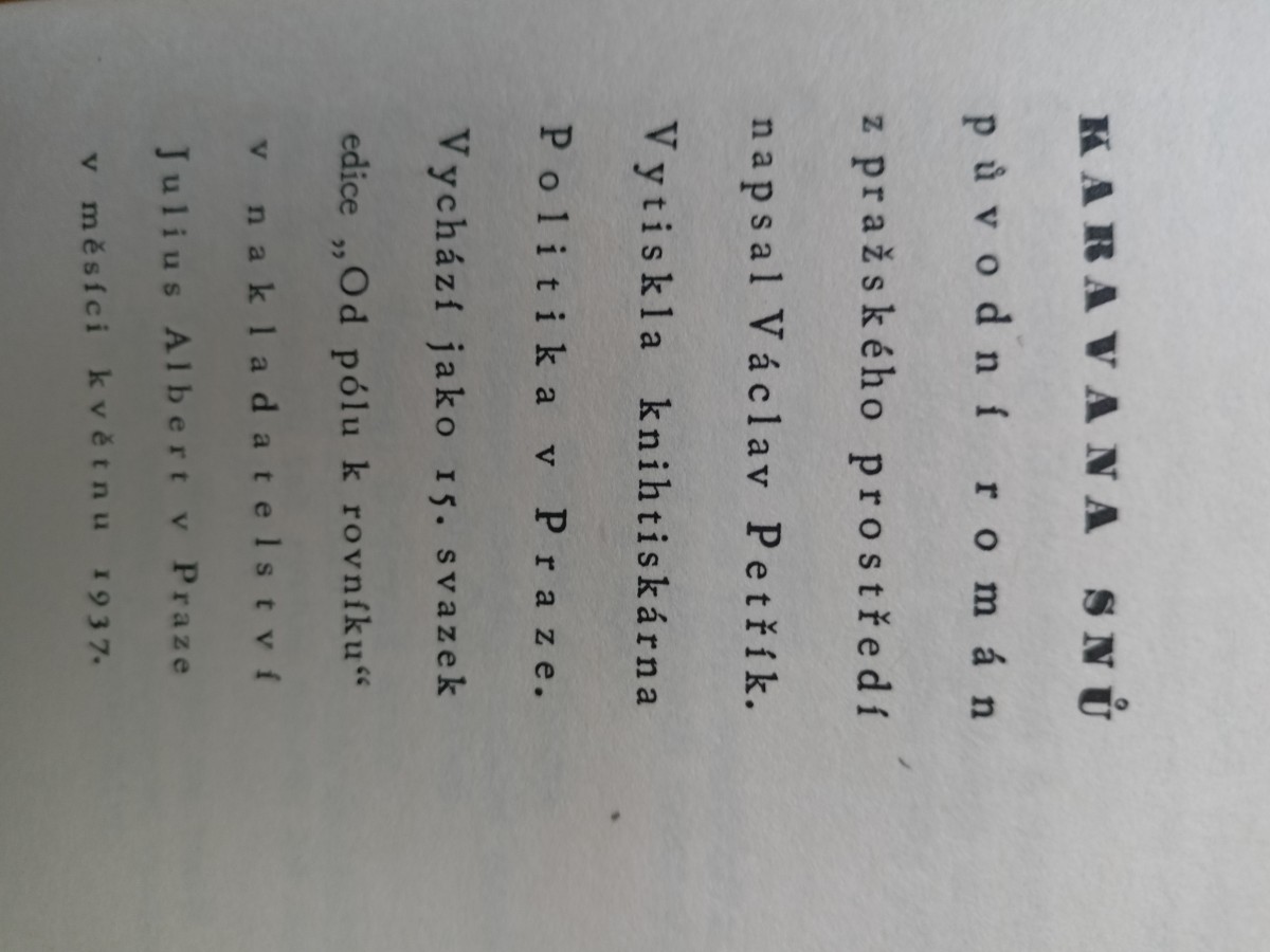 | Digitalizovaná tiráž: | KARAVANA SNU původní román z pražského prostředí napsal Václav Petřík. Vytiskla knih tiskárna Politika v Praze. Vychází jako 15. svazek edice,,Od pólu k rovníku" v nakladatelství Julius Albert v Praze v měsíci květnu 1937. |