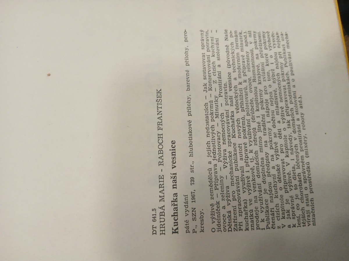 | Digitalizovaná tiráž: | DT 641.5 HRUBÁ MARIE-RABOCH FRANTIŠEK Kuchařka naší vesnice páté vydání P., SZN 1967, 739 str., hlubotiskové přílohy, barevné přílohy, pero- kresby. O výživě zemědělců a jejích nedostatcích - Jak sestavovat správný jídelníček - Příprava jednotlivých pokrmů - Konzervování potravin, Minutky Polotovary ovoce a zeleniny Výživa nemocných Dětská výživa - - - Z cizích kuchyní Prostírání a stolování Zařízení pro mechanické zpracovávání potravin. Při zpracovávání publikace Kuchařka naší vesnice (původně Naše kuchařka) využívali autoři nových vědeckých a technických po znatků ve výživě i přípravě pokrmů, přihlíželi k moderním formám prodeje na venkově, tj. k využívání polotovarů, k přípravě minutek, i k využívání domácích zdrojů (drůbeže, ovoce, zeleniny apod.). Publikace je doplněna mimo jiné i kapitolou Rozmanitosti, v niz čtenáři najdou předpisy na tradiční pokrmy krajové, na pokrmy z cizích kuchyní a na pokrmy i nápoje pro zvláštní příležitosti. V kapitole o dětské výživě se dočtou nejen o tom, které pokrmy a jak je připravovat pro děti a mladistvé, nýbrž i o výchově k správné výživě. V kapitole o výživě nemocných najdou vysvět lení, co je to dieta, i návody, jak připravovat pokrmy při nejčas tějších chorobách léčených v domácích podmínkách. Publikaci uza vírají stati o správném prostírání a stolování a o používání mecha nizačních prostředků (mixéry, roboty atd.). |