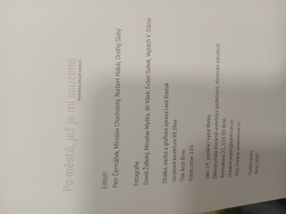 | Digitalizovaná tiráž: | Po městě, jež je mi souzeno Brněnská zákoutí v poezii Editori Petr Čermáček, Miroslav Chocholatý, Norbert Holub, Ondřej Slabý Fotografie David Židlický, Miroslav Myška, Jiří Víšek, Evžen Sobek, Vojtěch V. Sláma Obálka, sazba a grafická úprava Leoš Knotek Jazyková korektura Vít Slíva Tisk Arch Brno Počet stran 104 Jako 29. publikaci vydal Weles (Wendryňská literárně-estetická společnost, občanské sdružení) Kosmákova 21, 615 00 Brno redakce.weles@centrum.cz http://www.welesrevue.cz Vydání první Brno 2007 |