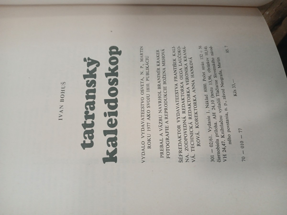 | Digitalizovaná tiráž: | IVAN BOHUŠ tatranský kaleidoskop VYDALO VYDAVATEĽSTVO OSVETA, N. P., MARTIN ROKU 1977 AKO SVOJU 1810. PUBLIKÁCIU PREBAL A VÄZBU NAVRHOL BRANIMÍR KRAKER FOTOGRAFIE A REPRODUKCIE BOŽENA MRHOVÁ ŠÉFREDAKTOR VYDAVATEĽSTVA FRANTIŠEK KALI- NA. ZODPOVEDNÁ REDAKTORKA OĽGA LAUČOKO- VÁ. TECHNICKÁ REDAKTORKA VERONIKA KRAMÁ- ROVÁ. KOREKTORKA ANNA HANKOVÁ 301-02/61. Vydanie 1. Náklad 8000. Počet strán 152 + 56 čiernobiela príloha. AH 24,10 (textu 13,96, obrázkov 10,14). VH 24,47. Kníhtlačou vytlačili Tlačiarne Slovenského národ- ného povstania, n. p., závod Neografia, Martin 70-010- 77 Kčs 33,- 85.7 |