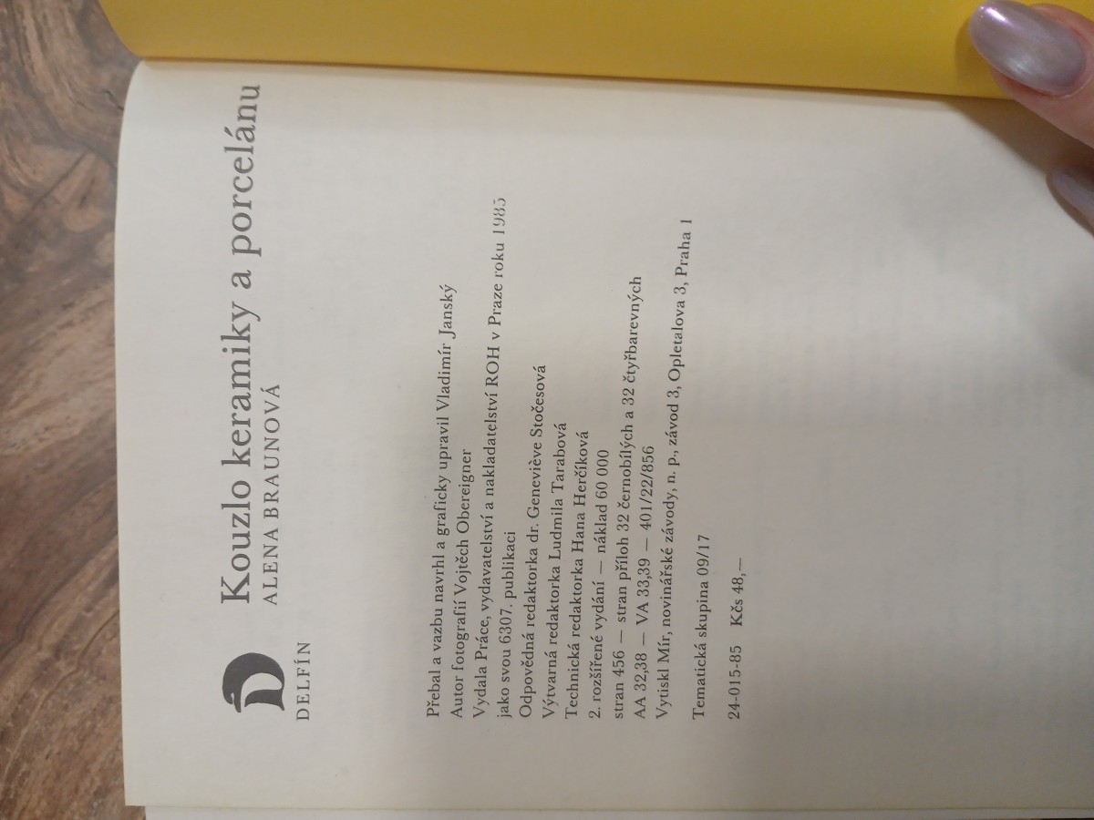| Digitalizovaná tiráž: | D Kouzlo keramiky a porcelánu ALENA BRAUNOVÁ DELFÍN Přebal a vazbu navrhl a graficky upravil Vladimír Janský Autor fotografií Vojtěch Obereigner Vydala Práce, vydavatelství a nakladatelství ROH v Praze roku 1985 jako svou 6307. publikaci Odpovědná redaktorka dr. Geneviève Stočesová Výtvarná redaktorka Ludmila Tarabová Technická redaktorka Hana Herčíková 2. rozšířené vydání - náklad 60 000 stran 456 - stran příloh 32 černobílých a 32 čtyřbarevných AA 32,38 VA 33,39-401/22/856 Vytiskl Mír, novinářské závody, n. p., závod 3, Opletalova 3, Praha 1 Tematická skupina 09/17 24-015-85 Kčs 48,- |