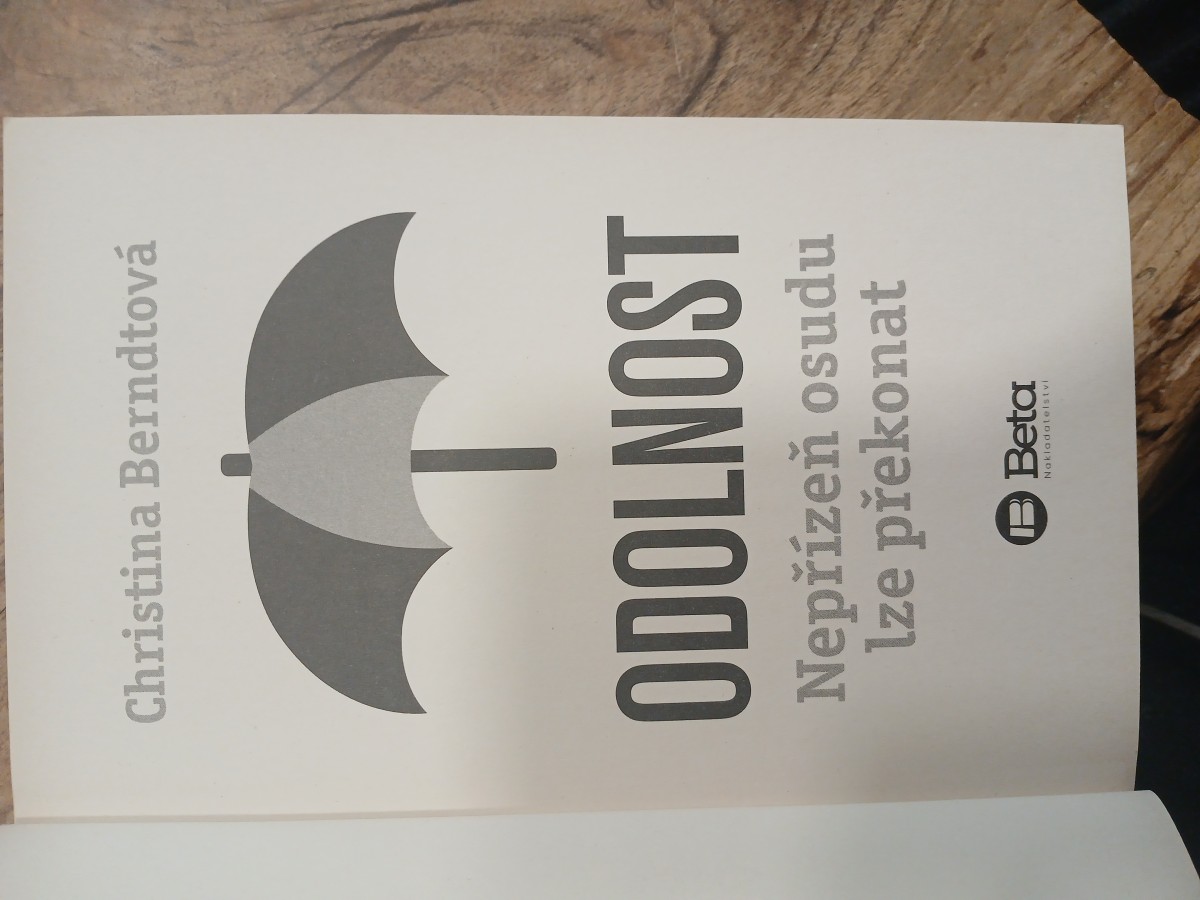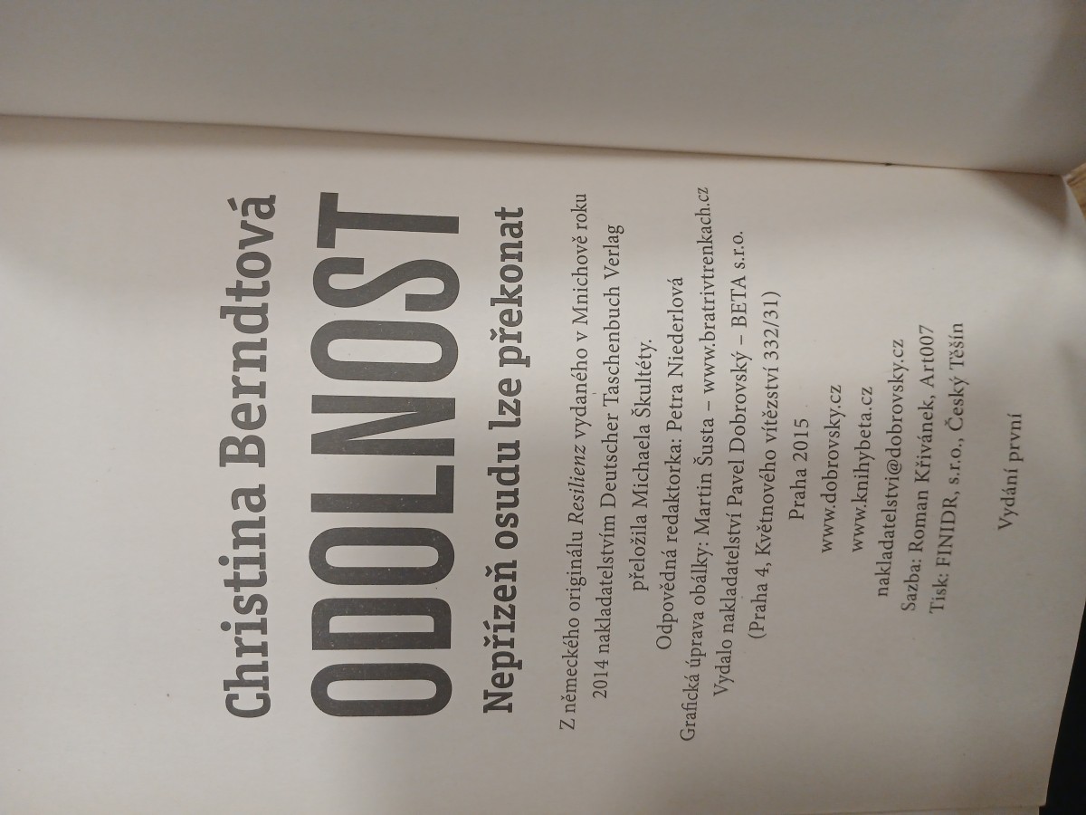 | Digitalizovaná tiráž: | Christina Berndtová ODOLNOST Nepřízeň osudu lze překonat Z německého originálu Resilienz vydaného v Mnichově roku 2014 nakladatelstvím Deutscher Taschenbuch Verlag přeložila Michaela Škultéty. Odpovědná redaktorka: Petra Niederlová Grafická úprava obálky: Martin Šusta - www.bratrivtrenkach.cz Vydalo nakladatelství Pavel Dobrovský - BETA s.r.o. (Praha 4, Květnového vítězství 332/31) Praha 2015 www.dobrovsky.cz www.knihybeta.cz nakladatelstvi@dobrovsky.cz Sazba: Roman Křivánek, Art007 Tisk: FINIDR, s.r.o., Český Těšín Vydání první |