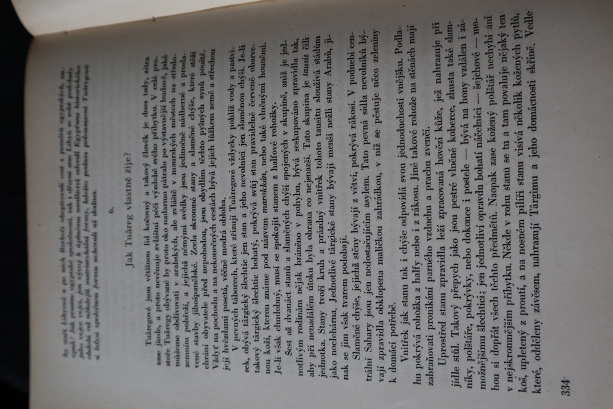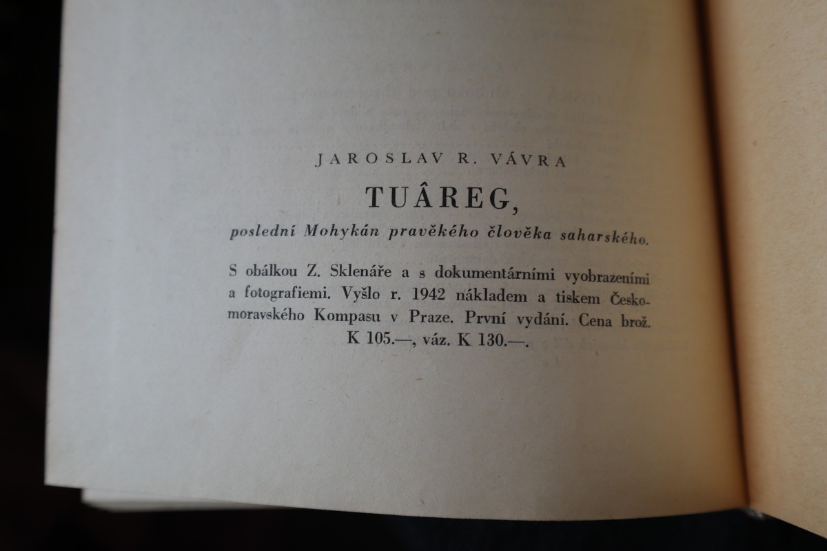 | Digitalizovaná tiráž: | JAROSLAV R. VÁVRA TUÂREG, poslední Mohykán pravěkého člověka saharského. S obálkou Z. Sklenáře a s dokumentárními vyobrazeními a fotografiemi. Vyšlo r. 1942 nákladem a tiskem Česko- moravského Kompasu v Praze. První vydání. Cena brož. K 105., váz. K 130.-. |