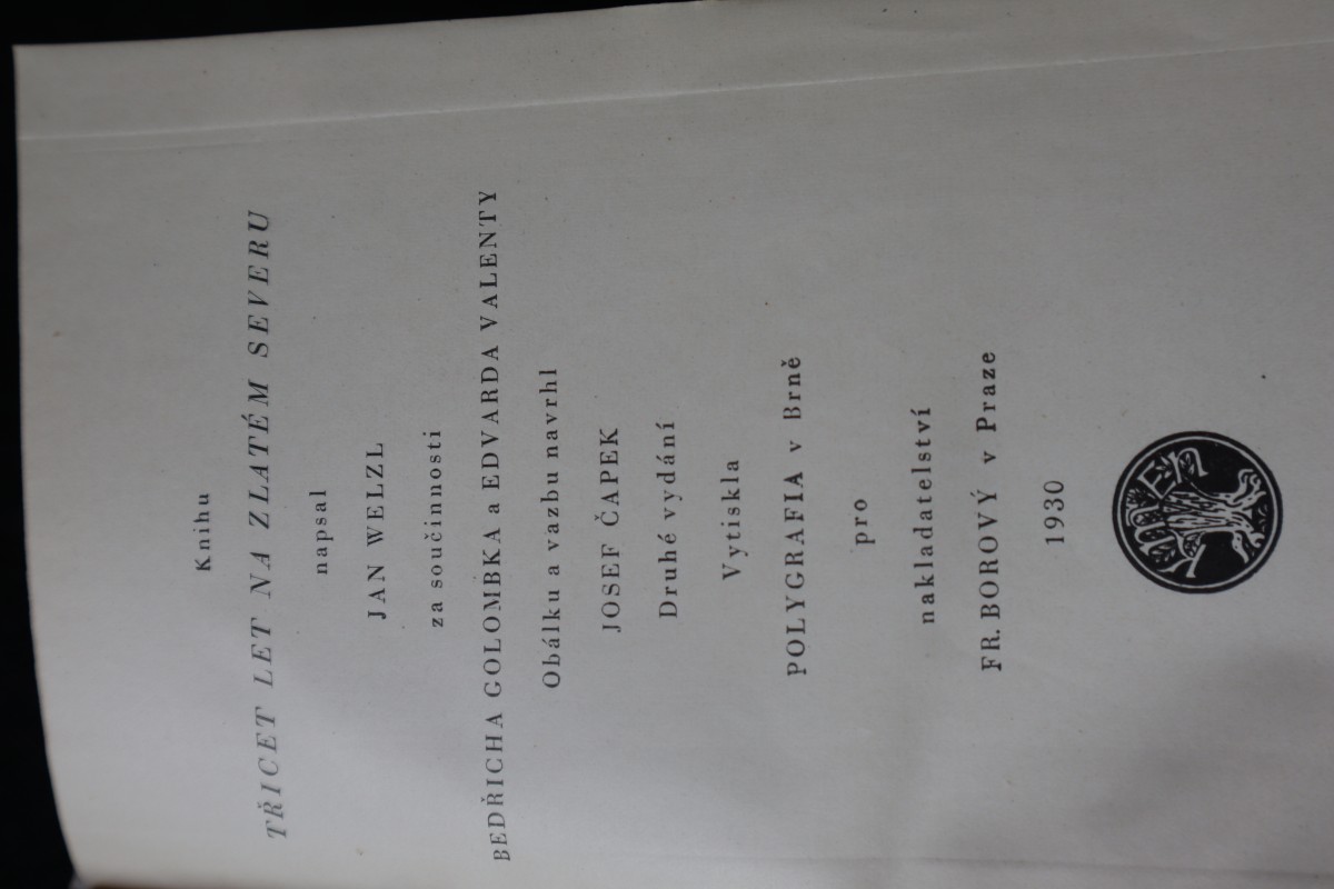| Digitalizovaná tiráž: | Knihu TŘICET LET NA ZLATÉM SEVERU napsal JAN WELZL za součinnosti BEDŘICHA GOLOMBKA a EDVARDA VALENTY Obálku a vazbu navrhl JOSEF ČAPEK Druhé vydání Vytiskla POLYGRAFIA v Brně pro nakladatelství FR. BOROVÝ v Praze 1930 三週 |
