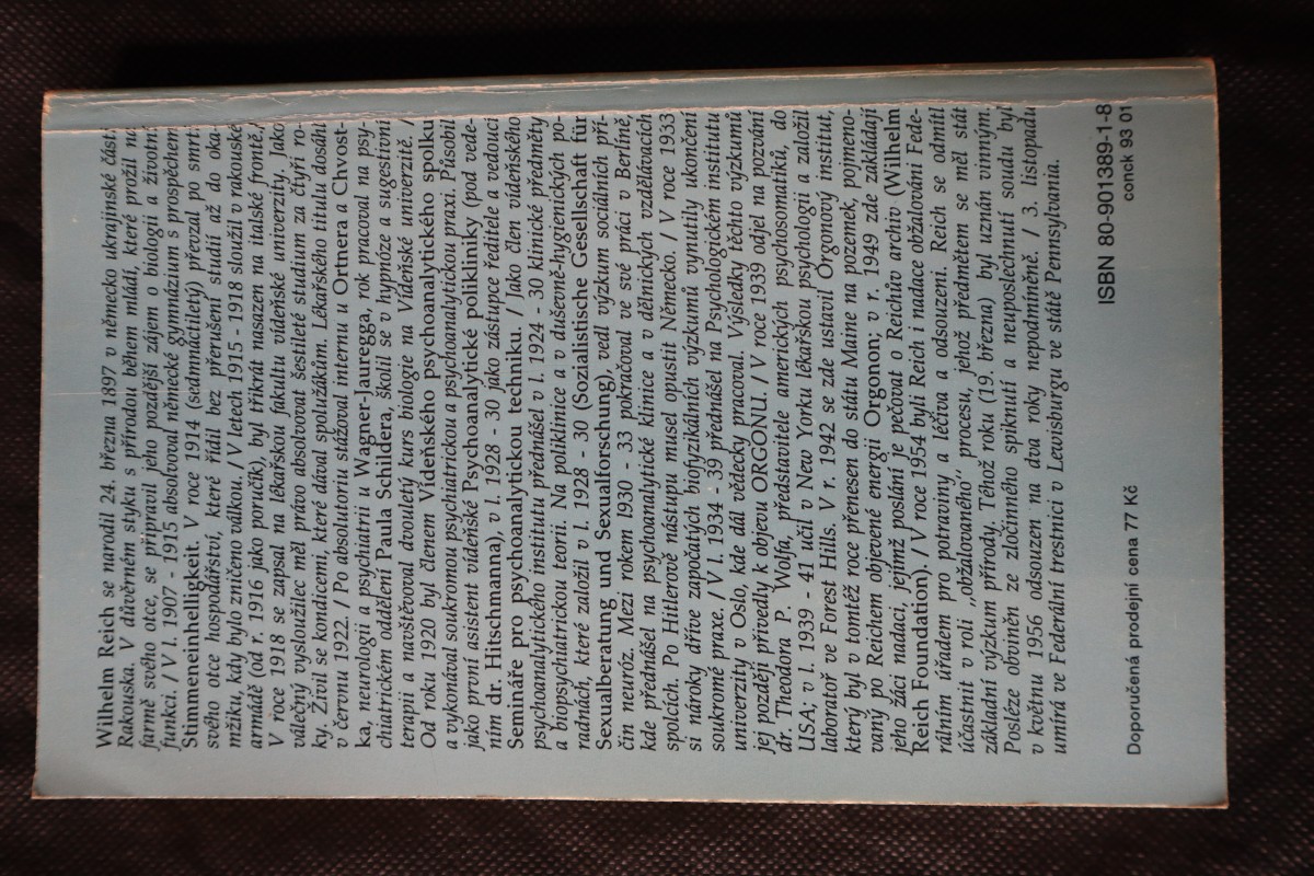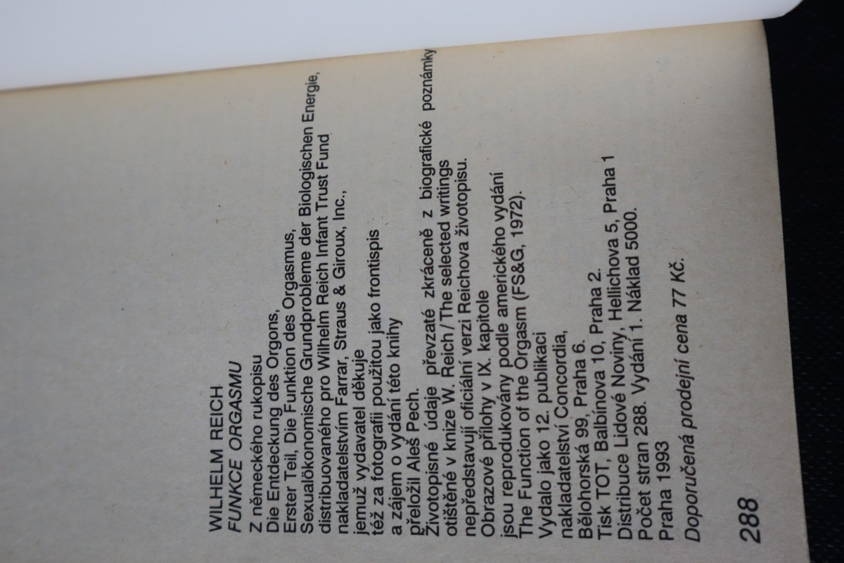 | Digitalizovaná tiráž: | WILHELM REICH FUNKCE ORGASMU Z německého rukopisu Die Entdeckung des Orgons, Erster Teil, Die Funktion des Orgasmus, Sexualökonomische Grundprobleme der Biologischen Energie, distribuovaného pro Wilhelm Reich Infant Trust Fund nakladatelstvím Farrar, Straus & Giroux, Inc., jemuž vydavatel děkuje též za fotografii použitou jako frontispis a zájem o vydání této knihy přeložil Aleš Pech. Životopisné údaje převzaté zkráceně z biografické poznámky otištěné v knize W. Reich/The selected writings nepředstavují oficiální verzi Reichova životopisu. Obrazové přílohy v IX. kapitole jsou reprodukovány podle amerického vydání The Function of the Orgasm (FS&G, 1972). Vydalo jako 12. publikaci nakladatelství Concordia, Bělohorská 99, Praha 6. Tisk TOT, Balbínova 10, Praha 2. Distribuce Lidové Noviny, Hellichova 5, Praha 1 Počet stran 288. Vydání 1. Náklad 5000. Praha 1993 Doporučená prodejní cena 77 Kč. 288 |