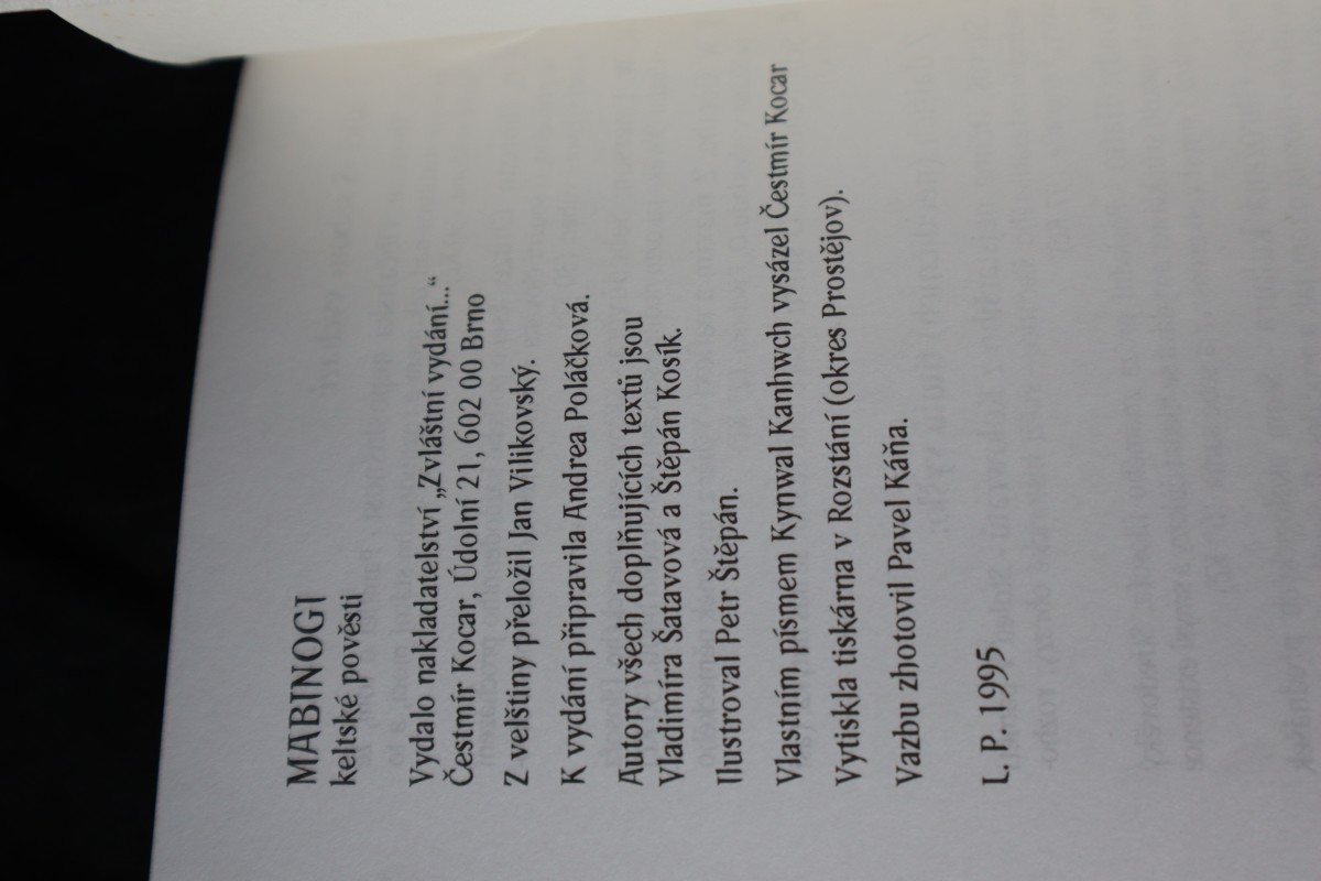 | Digitalizovaná tiráž: | MABINOGI keltské pověsti Vydalo nakladatelství „Zvláštní vydání..." Čestmír Kocar, Údolní 21, 602 00 Brno Z velštiny přeložil Jan Vilikovský. K vydání připravila Andrea Poláčková. Autory všech doplňujících textů jsou Vladimíra Šatavová a Štěpán Kosík. Ilustroval Petr Štěpán. Vlastním písmem Kynwal Kanhwch vysázel Čestmír Kocar Vytiskla tiskárna v Rozstání (okres Prostějov). Vazbu zhotovil Pavel Káňa. L. P. 1995 |