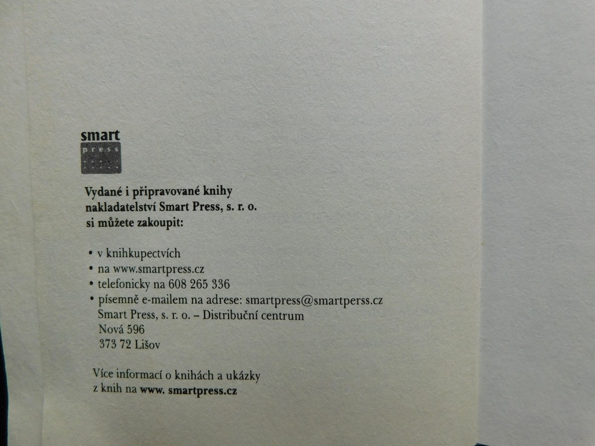 | Digitalizovaná tiráž: | smart press Vydané i připravované knihy nakladatelství Smart Press, s. r. o. si můžete zakoupit: ⚫ v knihkupectvích • na www.smartpress.cz . telefonicky na 608 265 336 · písemně e-mailem na adrese: smartpress@smartperss.cz Smart Press, s. r. o. - Distribuční centrum Nová 596 373 72 Lišov Více informací o knihách a ukázky z knih na www.smartpress.cz |