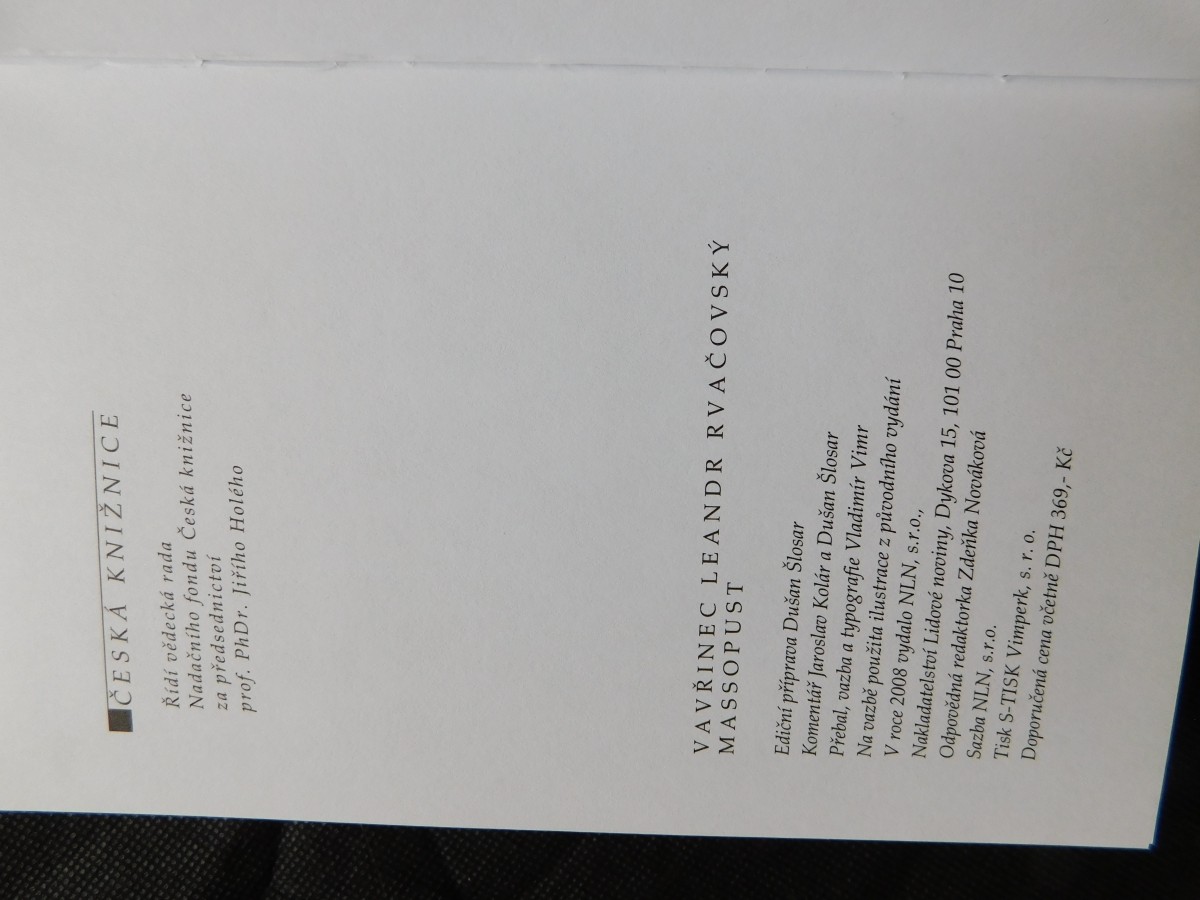| Digitalizovaná tiráž: | ČESKÁ KNIŽNICE Řídí vědecká rada Nadačního fondu Česká knižnice za předsednictví prof. PhDr. Jiřího Holého VAVŘINEC LEANDR RVAČOVSKÝ MASSOPUST Ediční příprava Dušan Šlosar Komentář Jaroslav Kolár a Dušan Šlosar Přebal, vazba a typografie Vladimír Vimr Na vazbě použita ilustrace z původního vydání V roce 2008 vydalo NLN, s.r.o., Nakladatelství Lidové noviny, Dykova 15, 101 00 Praha 10 Odpovědná redaktorka Zdeňka Nováková Sazba NLN, s.r.o. Tisk S-TISK Vimperk, s. r. o. Doporučená cena včetně DPH 369,- Kč |