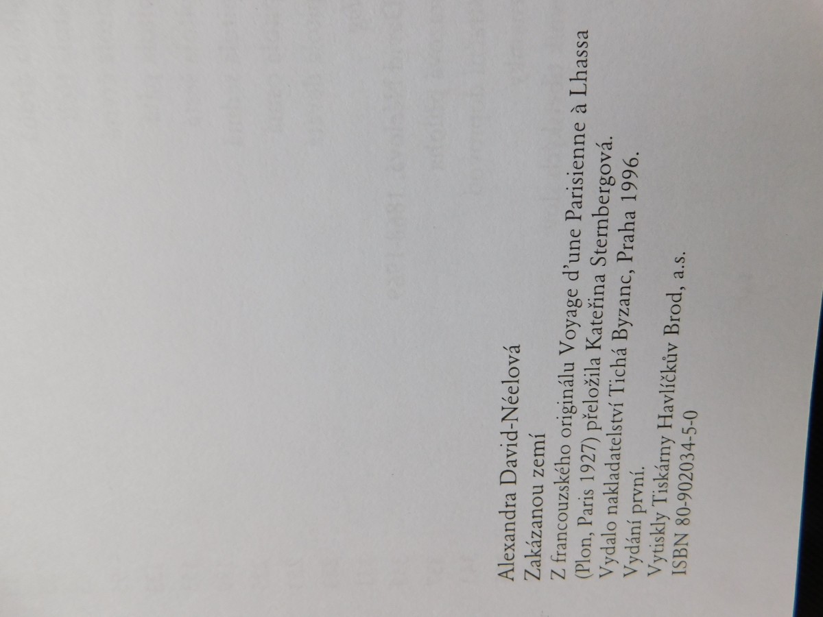 | Digitalizovaná tiráž: | Alexandra David-Néelová Zakázanou zemí Z francouzského originálu Voyage d'une Parisienne à Lhassa (Plon, Paris 1927) přeložila Kateřina Sternbergová. Vydalo nakladatelství Tichá Byzanc, Praha 1996. Vydání první. Vytiskly Tiskárny Havlíčkův Brod, a.s. ISBN 80-902034-5-0 |
