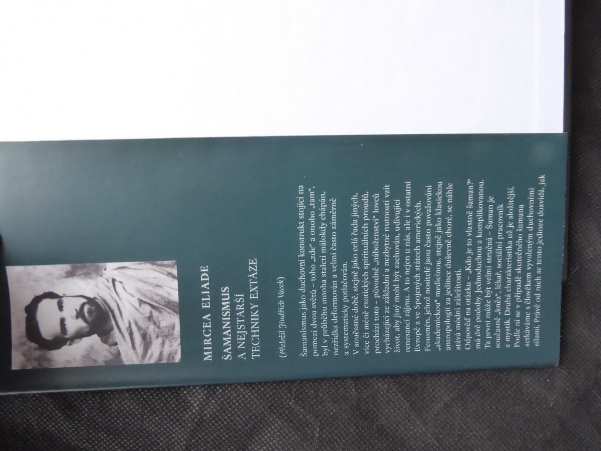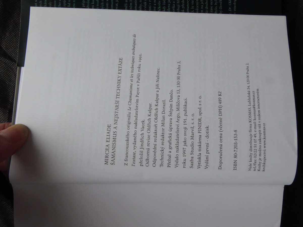 | Digitalizovaná tiráž: | ut S ých káne valy nov ho C způs lid o ou za přip= abože mi ku tvoř ých r osti s omun ovat, ja MIRCEA ELIADE SAMANISMUS A NEJSTARŠÍ TECHNIKY EXTÁZE Z francouzského originálu Le Chamanisme et les techniques archaïques de l'extase, vydaného nakladatelstvím Payot v Paříži roku 1992, přeložil Jindřich Vacek. Odborná revize Oldřich Kašpar. Odpovědní redaktoři Oldřich Kašpar a Jiří Našinec. Technický redaktor Milan Dorazil Přebal a grafická úprava Štěpán Danco. Vydalo nakladatelství Argo, Milíčova 13, 130 00 Praha 3, roku 1997 jako svoji 191. publikaci. Sazba Studio Marvil, s. r. O. Vytiskla tiskárna FINIDR, spol. s r. o. Vydání první - dotisk. měli am něm ž amanis nihy, n však m raxi v r ivé a nu Ačkoliv kdy žád alena ja erika al zňují hl ak předs amanov i, že vice svěceným en na jel Na druho zase ner bylo, byl ný člověk Doporučená cena (včetně DPH) 489 Kč ISBN 80-7203-153-8 Naše knihy distribuuje firma KOSMAS, Lublaňská 34, 120 00 Praha 2. tel./fax: 02/22 51 07 49, e-mail: kosmas@kosmas.cz Knihy je možno zakoupit též v našem internetovém knihkupectví: www.kosmas.cz Dr. Old v etnolog |
