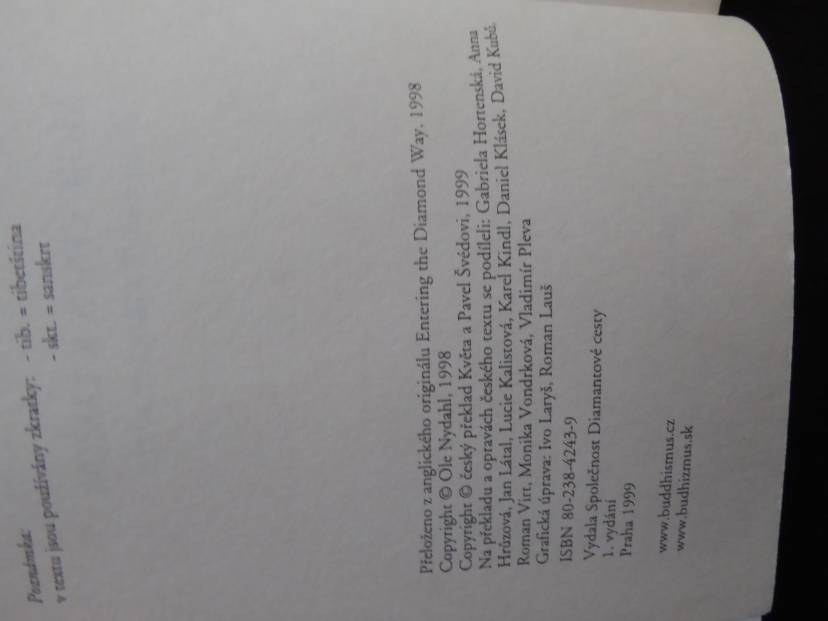 | Digitalizovaná tiráž: | Poznámka v textu jsou používány zkratky: - tib. = tibetstina - skt. = sanskrt Přeloženo z anglického originálu Entering the Diamond Way, 1998 Copyright Ole Nydahl, 1998 Copyright český překlad Květa a Pavel Švédovi, 1999 Na překladu a opravách českého textu se podíleli: Gabriela Hortenská, Anna Hrůzová, Jan Látal, Lucie Kalistová, Karel Kindl, Daniel Klásek, David Kubů. Roman Virt, Monika Vondrková, Vladimír Pleva Grafická úprava: Ivo Larys, Roman Lauš ISBN 80-238-4243-9 Vydala Společnost Diamantové cesty 1. vydání Praha 1999 www.buddhismus.cz www.budhizmus.sk |