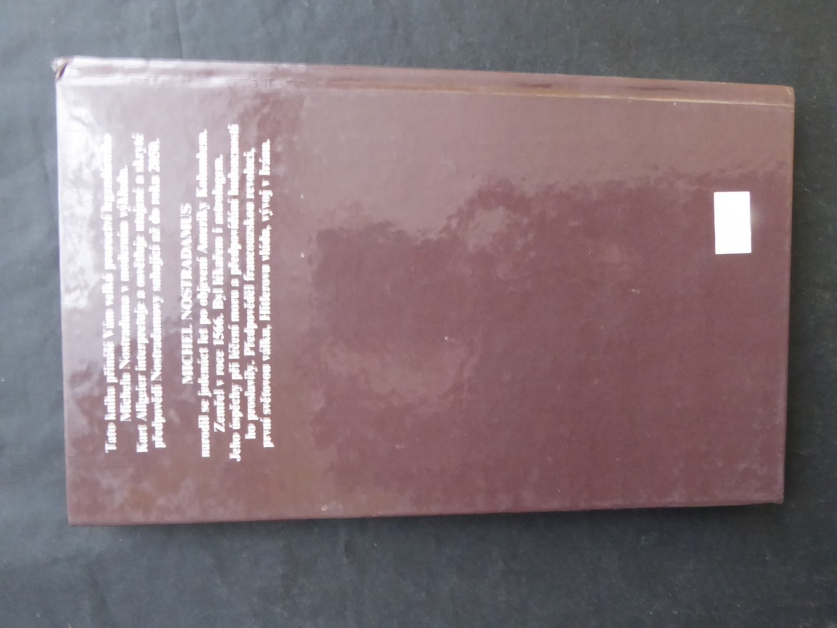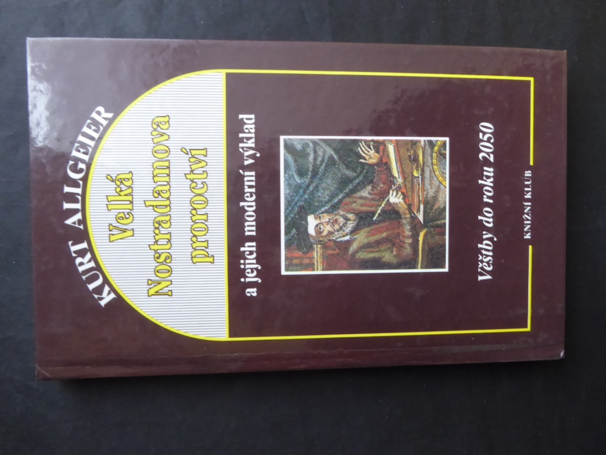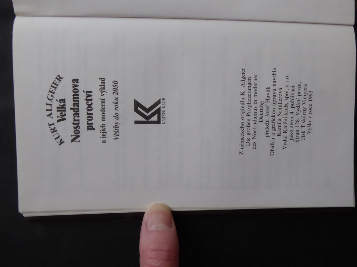 | Digitalizovaná tiráž: | KURT Velká ALLGEIER Nostradamova proroctví a jejich moderní výklad Věštby do roku 2050 K KNIŽNÍ KLUB Z německého originálu K. Allgeier Die großen Prophezeiungen des Nostradamus in moderner Deutung přeložil Josef Havlík Obálku a grafickou úpravu navrhla Kamila Schüllerová Vydal Knižní klub, spol, s r.o. jako svou 4. publikaci. Stran 128. Vydání první. Tisk Tiskárny Vimperk Vyšlo v roce 1993 |
