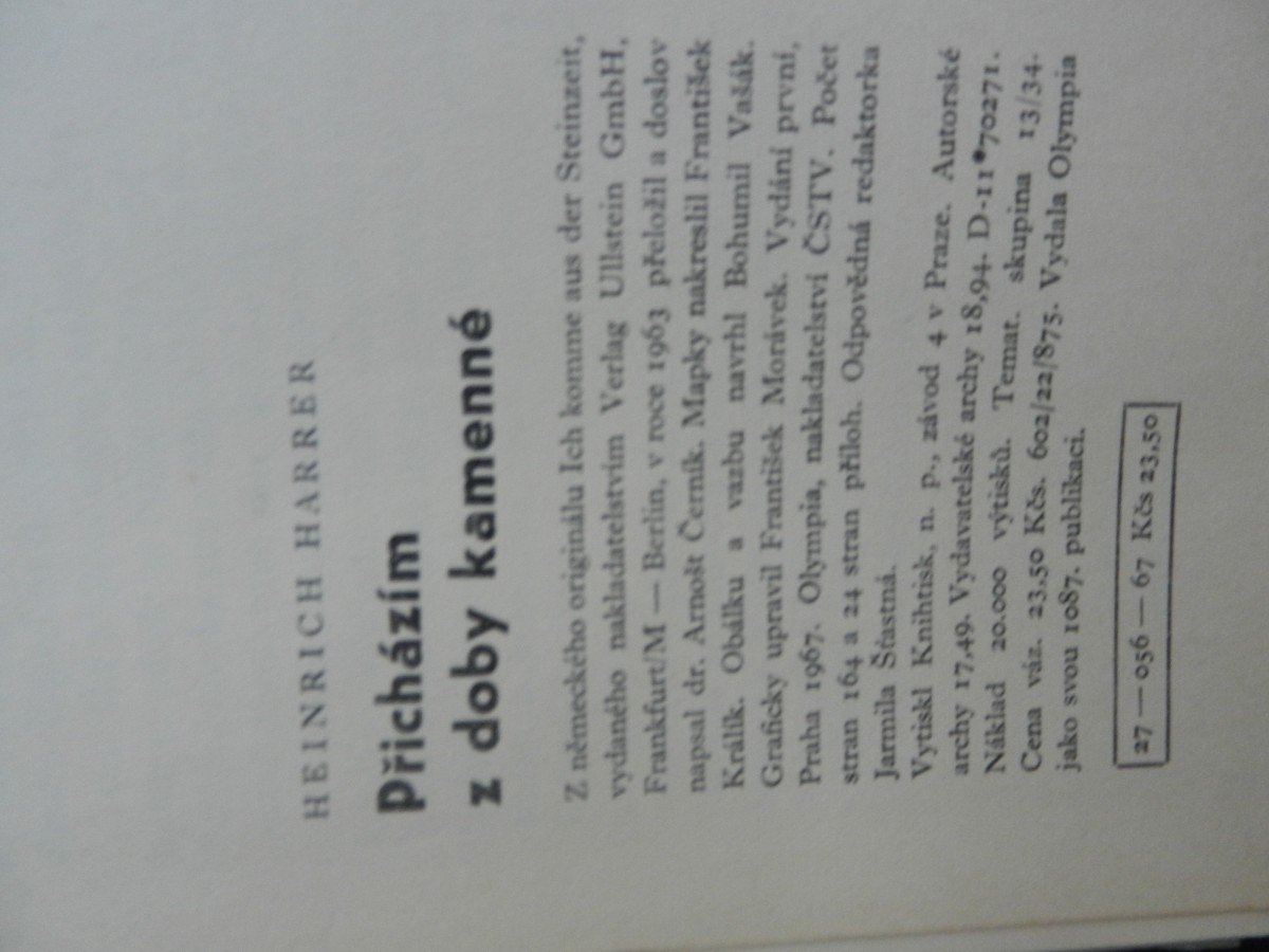 | Digitalizovaná tiráž: | HEINRICH HARRER Přicházím z doby kamenné - Z německého originálu Ich komme aus der Steinzeit, vydaného nakladatelstvím Verlag Ullstein GmbH, Frankfurt/M Berlin, v roce 1963 přeložil a doslov napsal dr. Arnošt Černik. Mapky nakreslil František Králik. Obálku a vazbu navrhl Bohumil Vašák. Graficky upravil František Morávek. Vydání první, Praha 1967. Olympia, nakladatelství ČSTV. Počet stran 164 a 24 stran příloh. Odpovědná redaktorka Jarmila Stastná. Vytiskl Knihtisk, n. p., závod 4 v Praze. Autorské archy 17,49. Vydavatelské archy 18,94. D-11*70271. Náklad 20.000 výtisků. Temat. skupina 13/34- Cena váz. 23,50 Kčs. 602/22/875. Vydala Olympia jako svou 1087. publikaci. 27 -056-67 Kčs 23,50 |