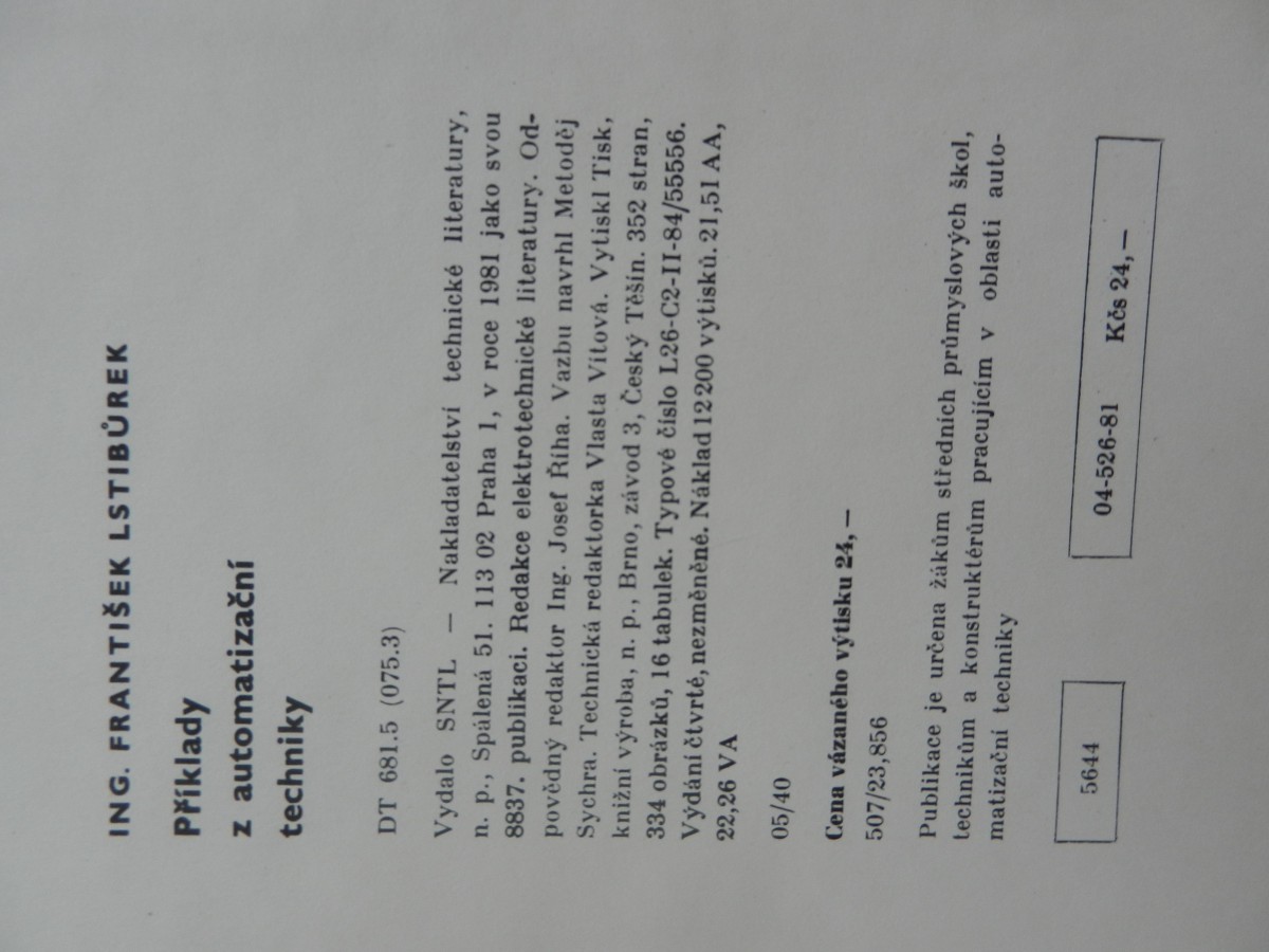 | Digitalizovaná tiráž: | ING. FRANTIŠEK LSTIBŮREK Příklady z automatizační techniky DT 681.5 (075.3) Vydalo SNTL Nakladatelství technické literatury, n. p., Spálená 51. 113 02 Praha 1, v roce 1981 jako svou 8837. publikaci. Redakce elektrotechnické literatury. Od- povědný redaktor Ing. Josef Říha. Vazbu navrhl Metoděj Sychra. Technická redaktorka Vlasta Vitová. Vytiskl Tisk, knižní výroba, n. p., Brno, závod 3, Český Těšín. 352 stran, 334 obrázků, 16 tabulek. Typové číslo L26-C2-II-84/55556. Výdání čtvrté, nezměněné. Náklad 12 200 výtisků. 21,51 AA, 22,26 VA 05/40 Cena vázaného výtisku 24,- 507/23,856 Publikace je určena žákům středních průmyslových škol, technikům a konstruktérům pracujícím v matizační techniky oblasti auto- 5644 04-526-81 Kčs 24,- |